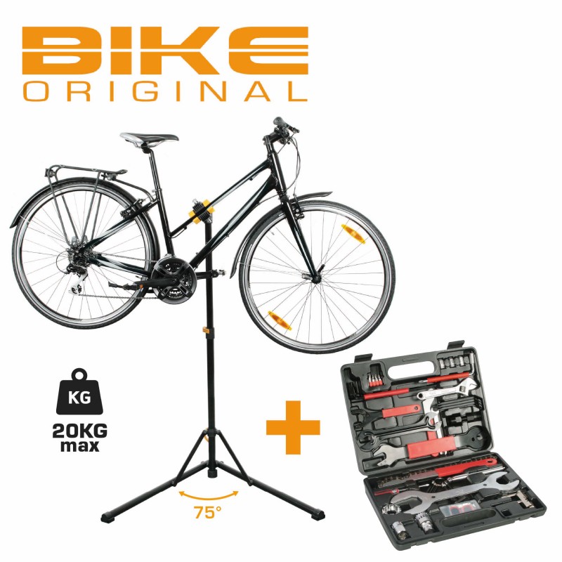 PACK PROMO composé d'un pied d'atelier pliable EASYWORK II de la marque BIKE ORIGINAL et d'une mallette à outils de 37 pièces.