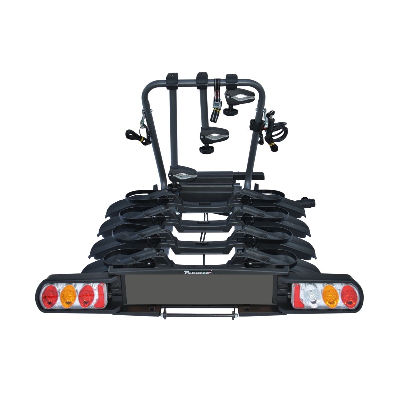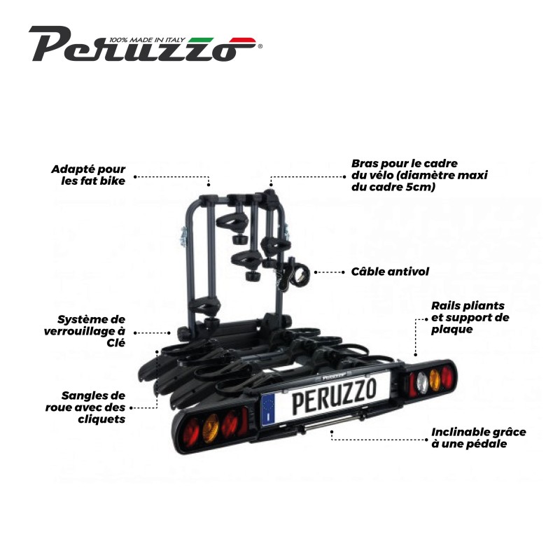 Le porte-vélo universel sur attelage PURE INSTINCT de la marque PERUZZO vous permettra de transporter jusqu’à 4 vélos (60kg maximum). Le porte-vélo peut transporter des Fat Bike. Chaque vélo est maintenu par un bras. Il y a un câble antivol à clé fourni. Ce porte-vélo est inclinable grâce à une pédale permettant d’accéder au coffre très facilement sans avoir à tout démonter. Livré entièrement assemblé, il se plie ce qui permet un rangement simple et rapide.