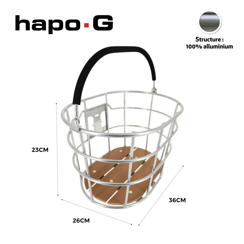 Ce panier avant pour vélo de la marque HAPO G est ultra léger grâce à sa structure 100% aluminium. Il permet le transport d'un volume important, jusqu'à 21,5 litres et supporte une charge jusqu'à 5 kg.