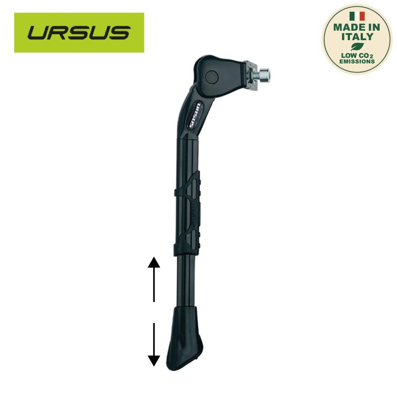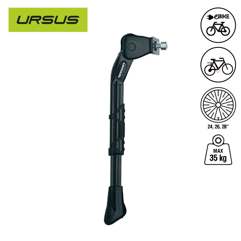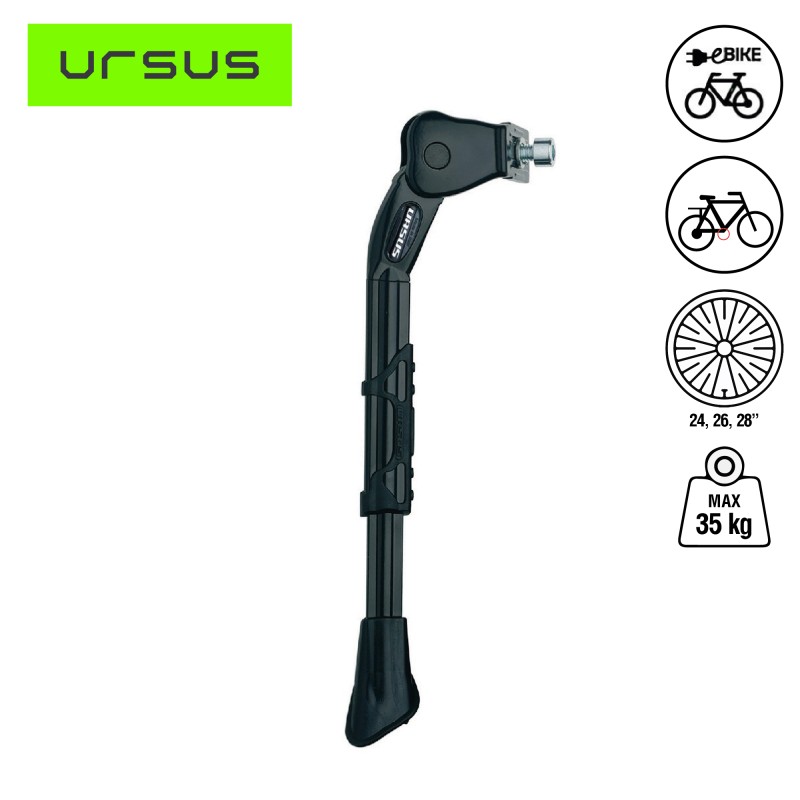 La béquille centrale King 78 noire de la marque URSUS, conçue en aluminium, convient aux vélos électriques, aux vélos équipés d'un siège enfant et de sacoches de voyageElle supporte une charge maximale de 35kg.