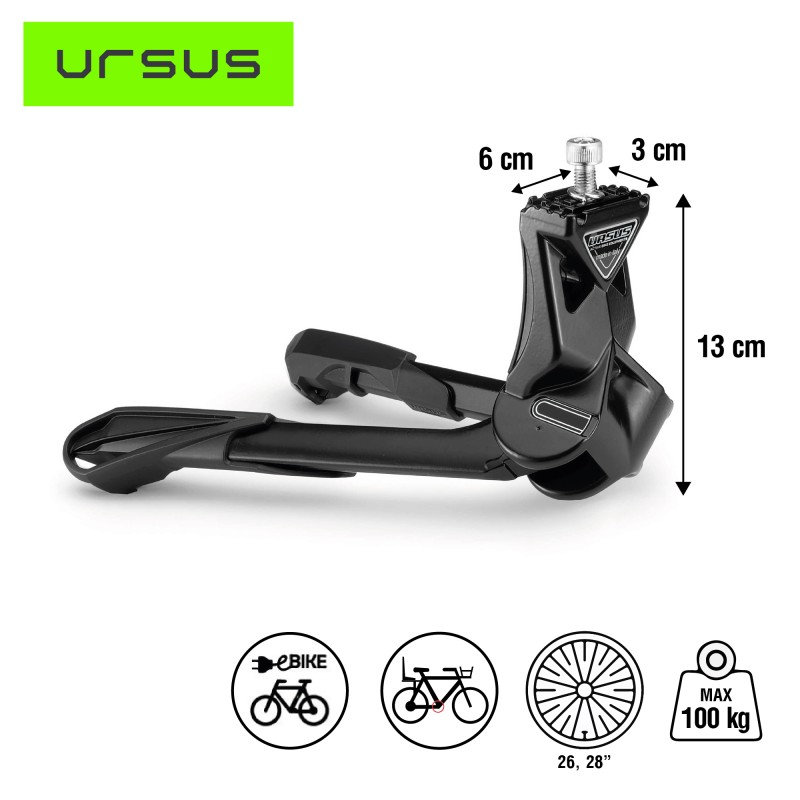 La béquille double JUMBO 80 de la marque URSUS, conçue en aluminium, est idéale pour les vélos lourds, les vélos électriques, les Mama-bikes, les vélos avec porte-bébé, les tandems et les vélos de ville. Elle supporte une charge de 100 kg max.