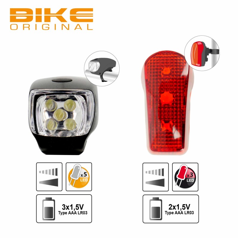 Ce kit d'éclairage de la marque BIKE ORIGINAL a été conçu pour maximiser la visibilité du cycliste lors de ses déplacements nocturnes.