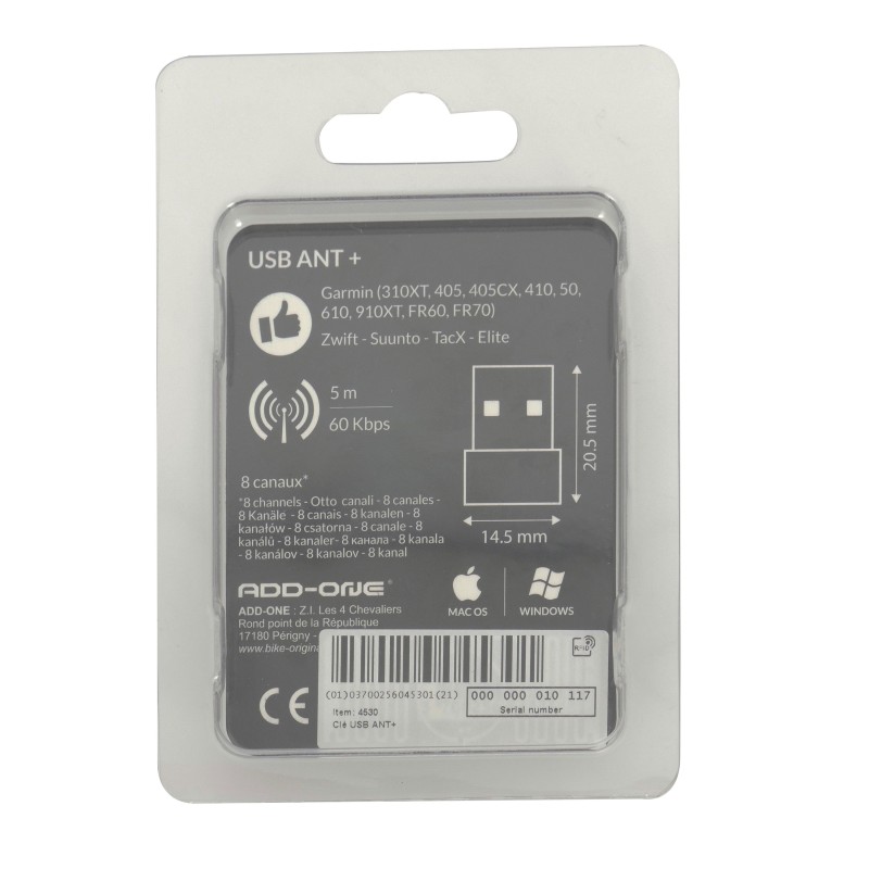 Sans fil, avec une portée de transmission de 5 mètres, la clé est compatible avec la marque Garmin (310XT, 405, 405CX, 410, 50, 610, 910XT, FR60, FR70) ainsi que les marques Zwift, Suunto, TacX et Elite.