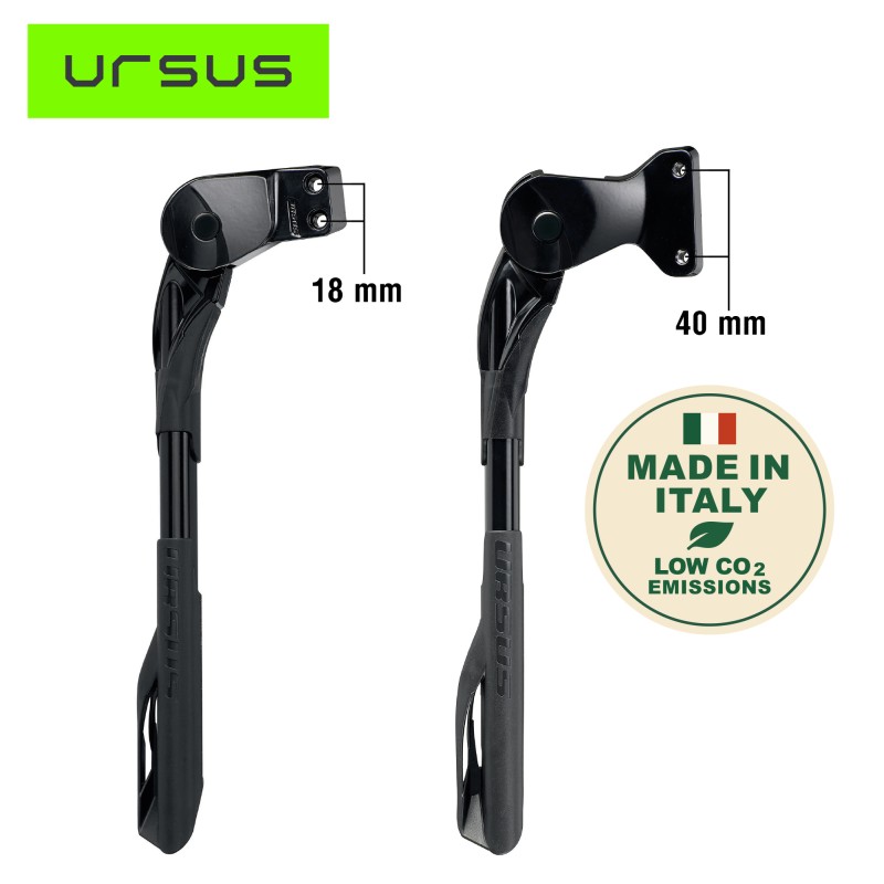 La béquille latérale WAVE de la marque URSUS possède une tête conçue pour être montée sur la base arrière du vélo en entraxe 18 ou 40mm (espace entre les deux trous de fixation).