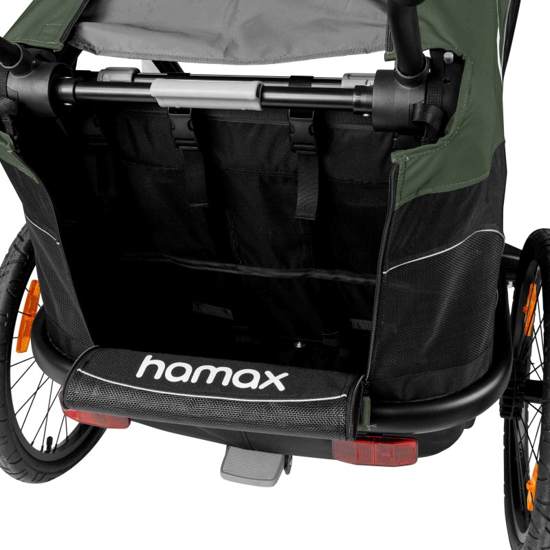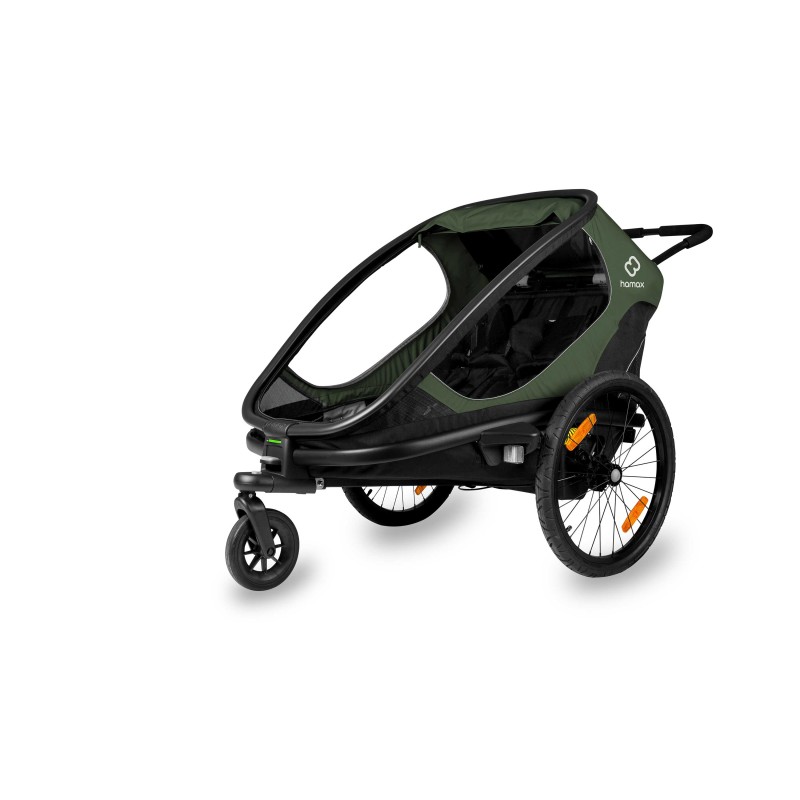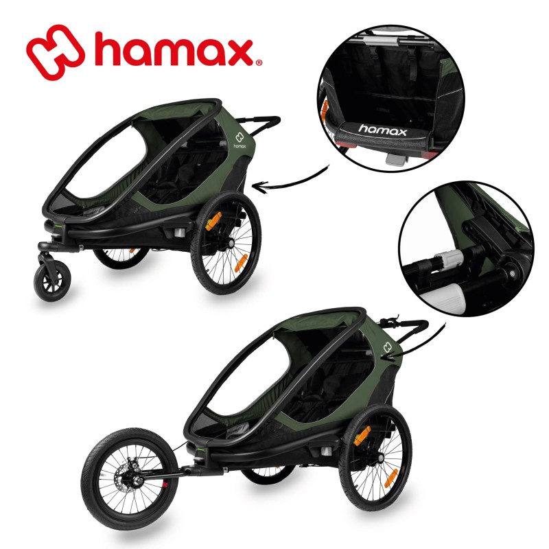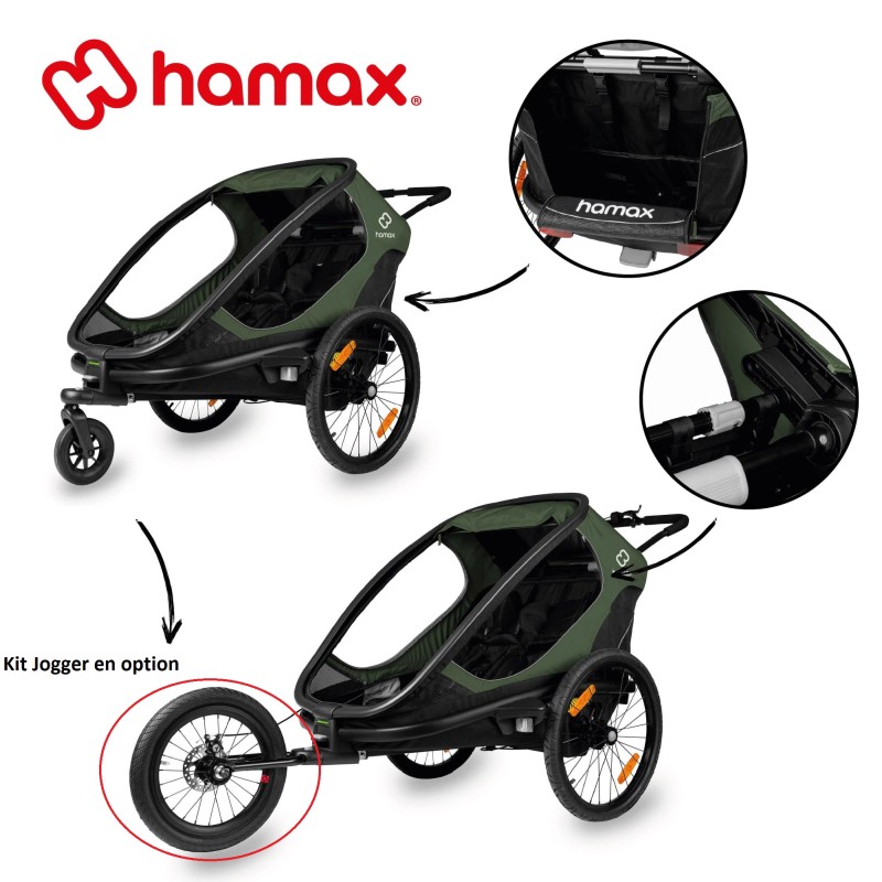 L'OUTBACK Jogger Kit de la marque HAMAX comporte une roue de 16 pouces avec un frein à une main ainsi qu'une sangle de sécurité.Il garantit la stabilité de la remorque lors de randonnées et courses à pied, afin de garantir le confort des enfants.Son cadre en aluminium léger permet de manœuvrer facilement la remorque même sur des terrains sinueux.