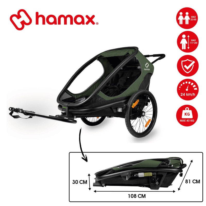 Légère et ultra-confortable, la remorque OUTBACK de la marque HAMAX permet aux enfants d'être protégés lors de balades à vélo, vélo électrique ou de randonnées. Elle garantit leur confort grâce à ses sièges inclinables et à ses grandes fenêtres permettant à l'enfant de regarder à l'extérieur. Les réflecteurs à l'avant, à l'arrière et sur les roues...