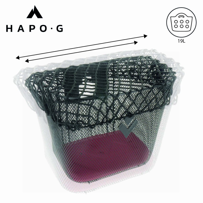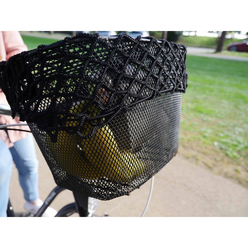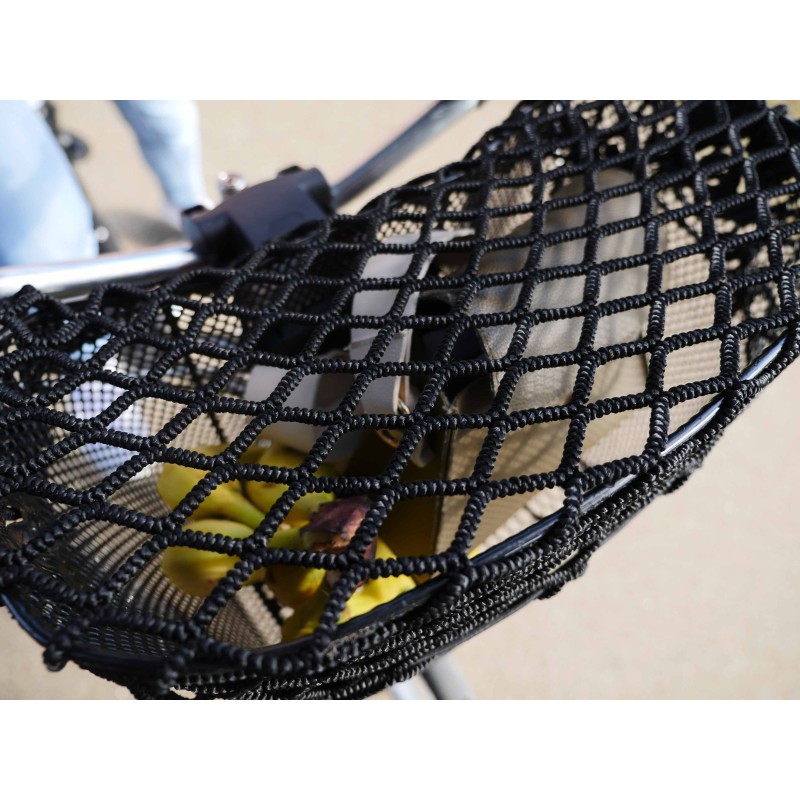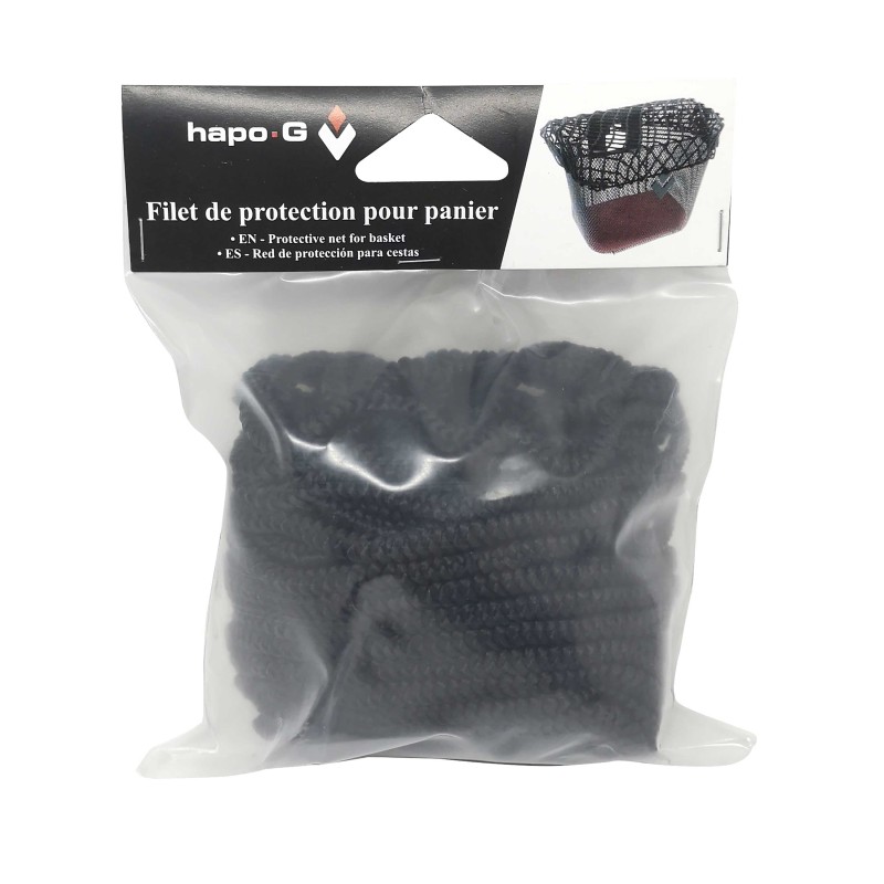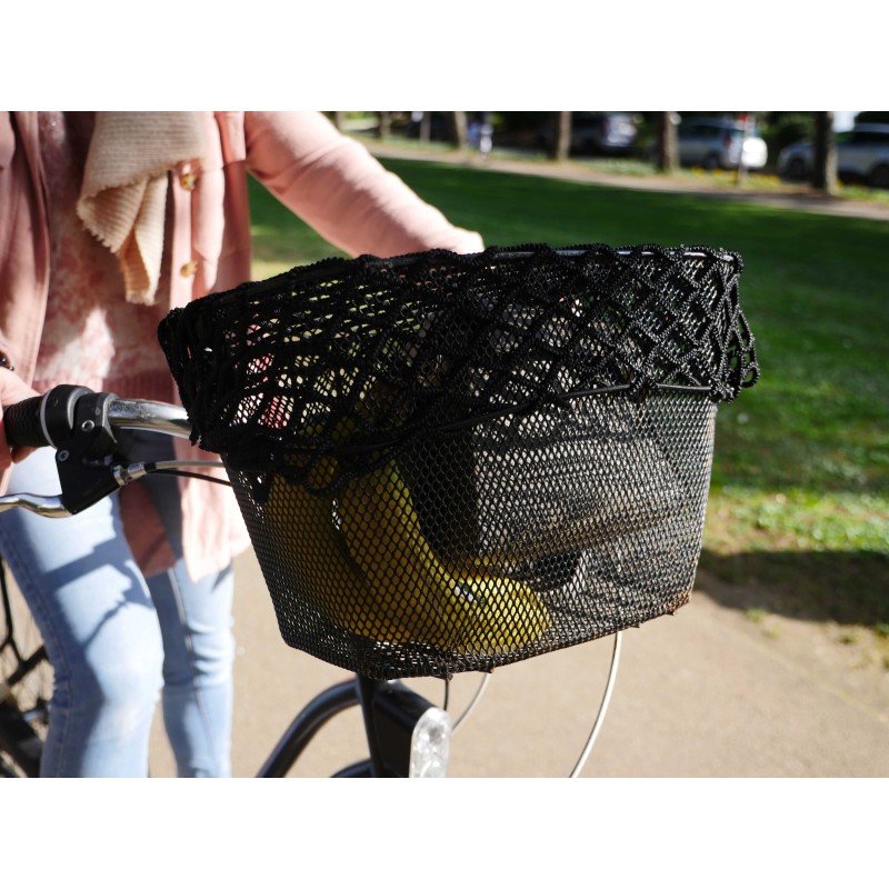 Ce filet de protection de la marque HAPO-G sécurise le contenu d'un panier de vélo.
