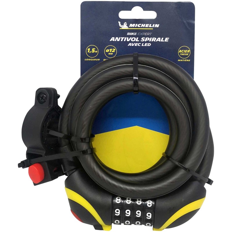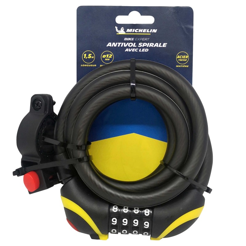 L'antivol câble spirale de la marque MICHELIN est conçu pour attacher aussi bien les composants (roue, selle) que les accessoires (sacoche, panier...) du vélo.Il s'enroule automatiquement, et prend très peu de place dans un sac ou une sacoche, il accompagnera le cycliste partout.Son tout nouveau design s'inspire des pneus iconiques de chez Michelin.