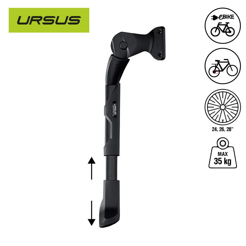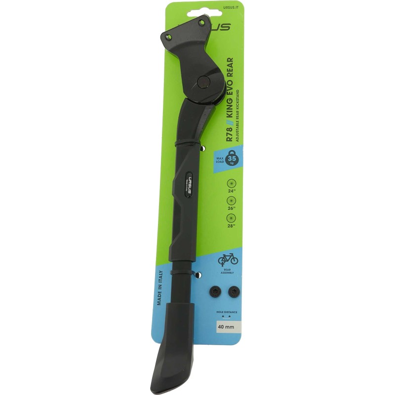 La béquille centrale King 78 noire de la marque URSUS, conçue en aluminium, convient aux vélos électriques, aux vélos équipés d'un siège enfant et de sacoches de voyage. Elle supporte une charge maximale de 35kg.Elle est compatible avec les vélos de 24 à 28". La béquille est ajustable en hauteur grâce à une vis de réglage.Elle est...
