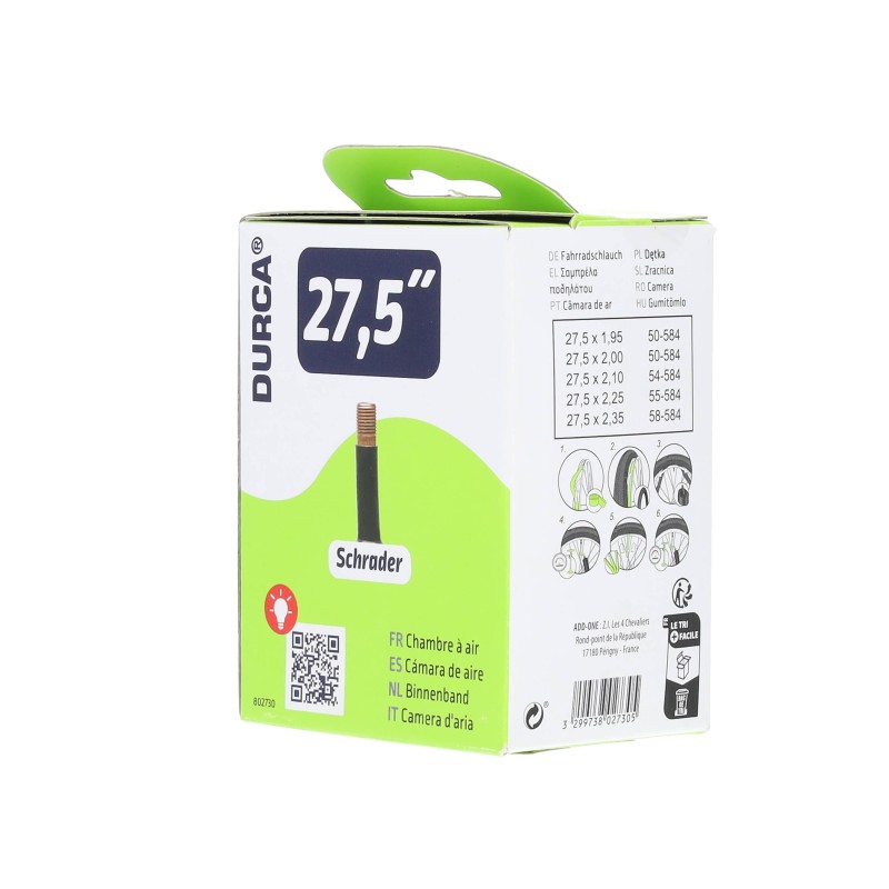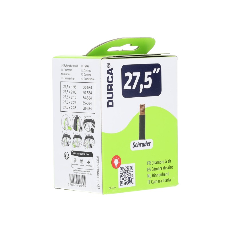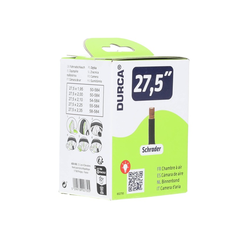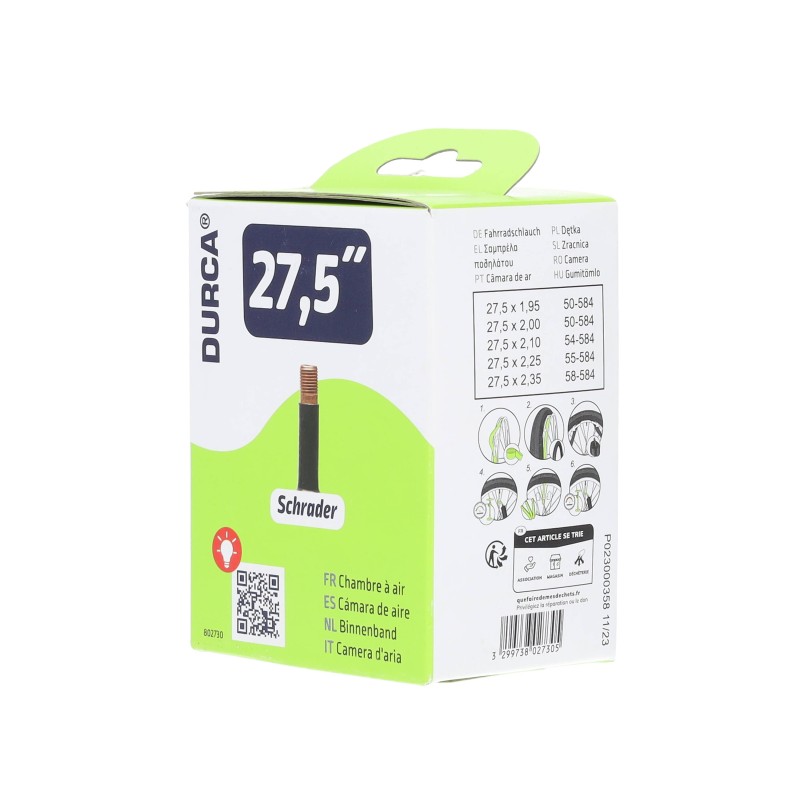 Chambre à air 27,5"x1,95/2,35. La chambre à air est équipée d'une valve SCHRADER. Elle est idéale pour remplacer une ancienne chambre à air suite à une crevaison.