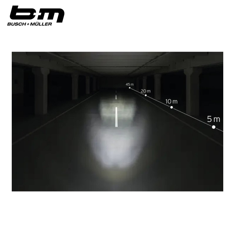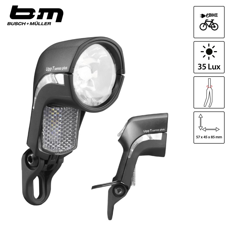 Le phare avant pour E-Bike LUMOTEC Upp E de la marque BUSH & MULLER est un phare au design délicat avec des lignes très claires.