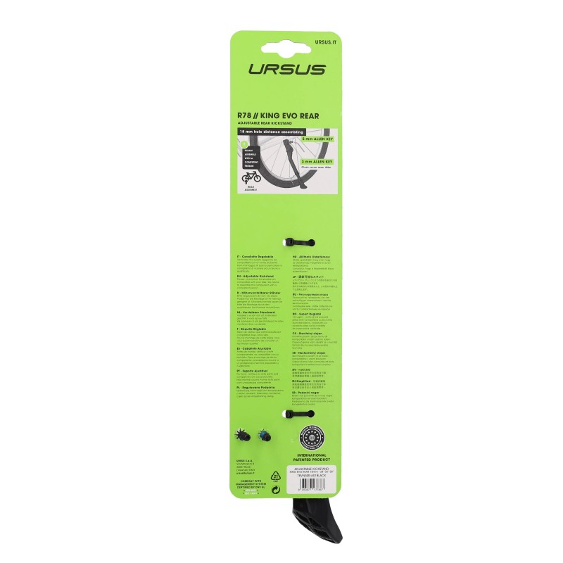 Adaptée aux vélos de 24"-26"-27.5" et 28" et particulièrement aux E-Bikes, la béquille latérale King evo rear est disponible avec une plaque de fixation 18mm.
