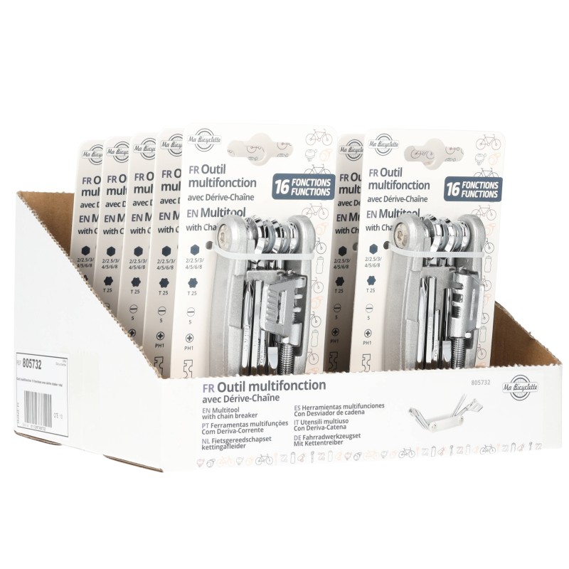 Outil 16 fonctions avec dérive chaîne de la marque MA BICYCLETTE, l'outil indispensable qui se glisse facilement dans une sacoche de selle ou dans un sac à dos.