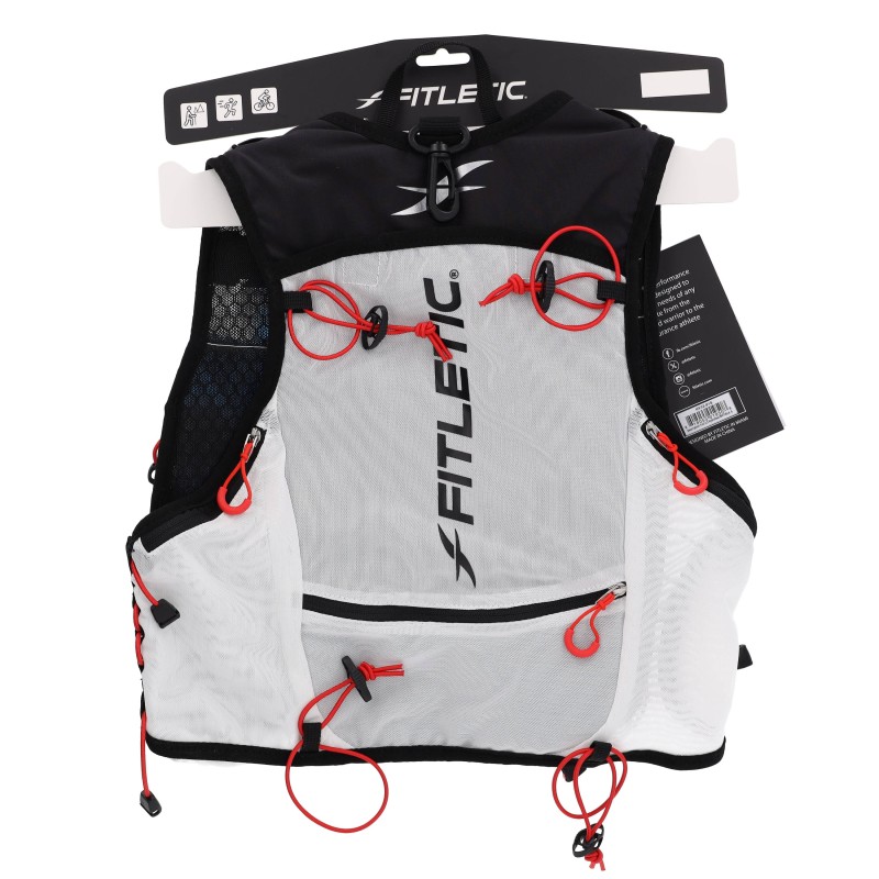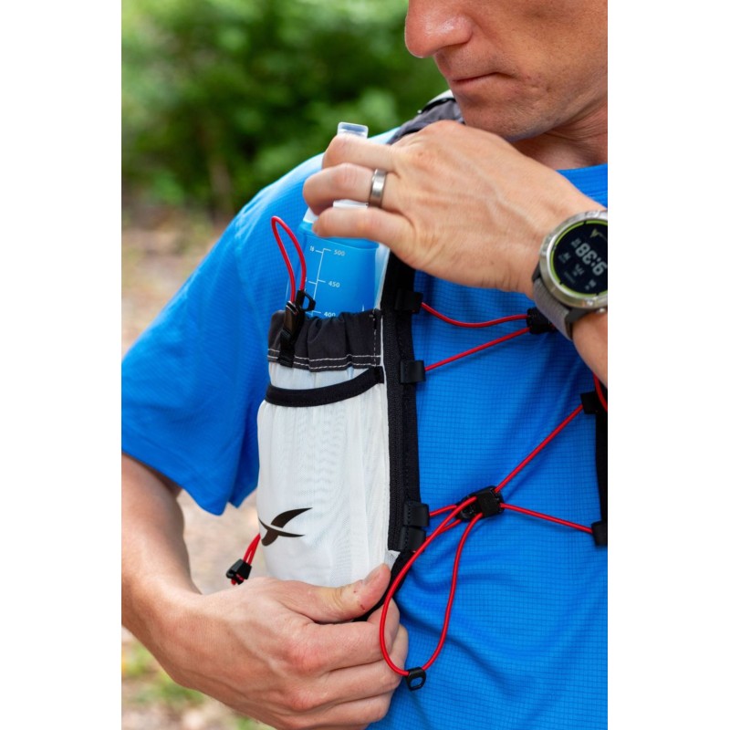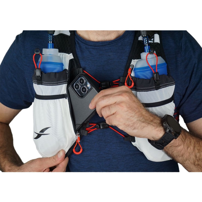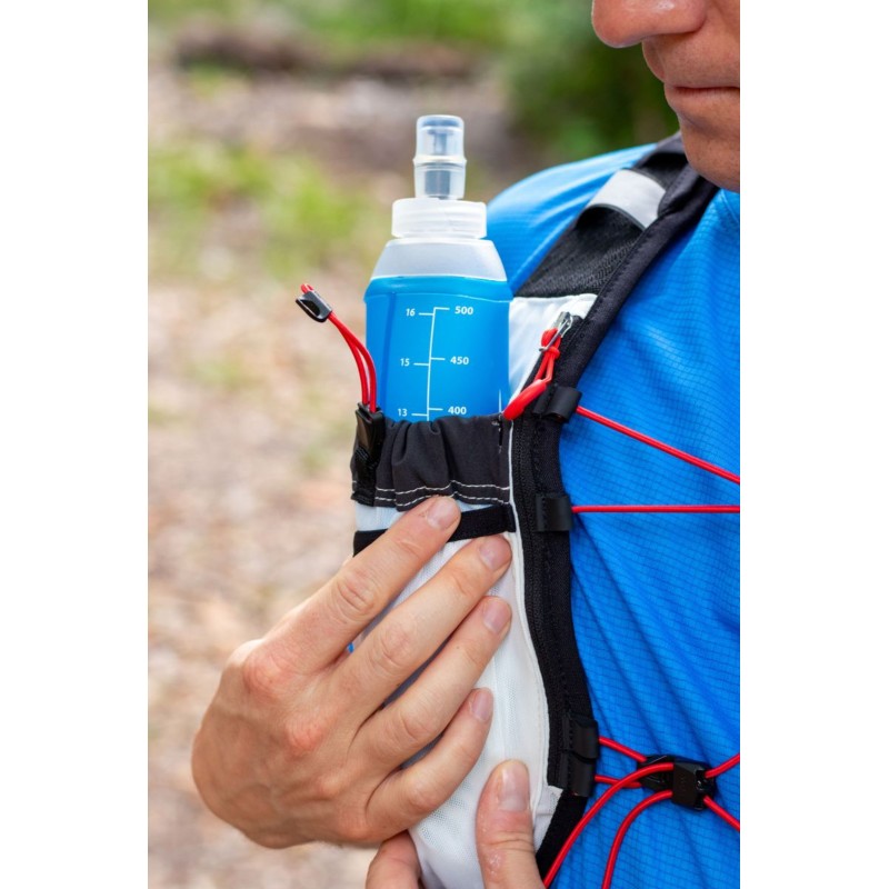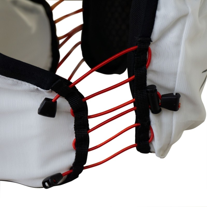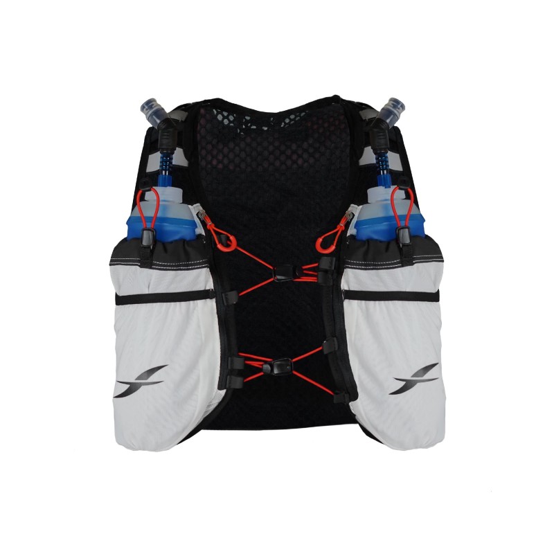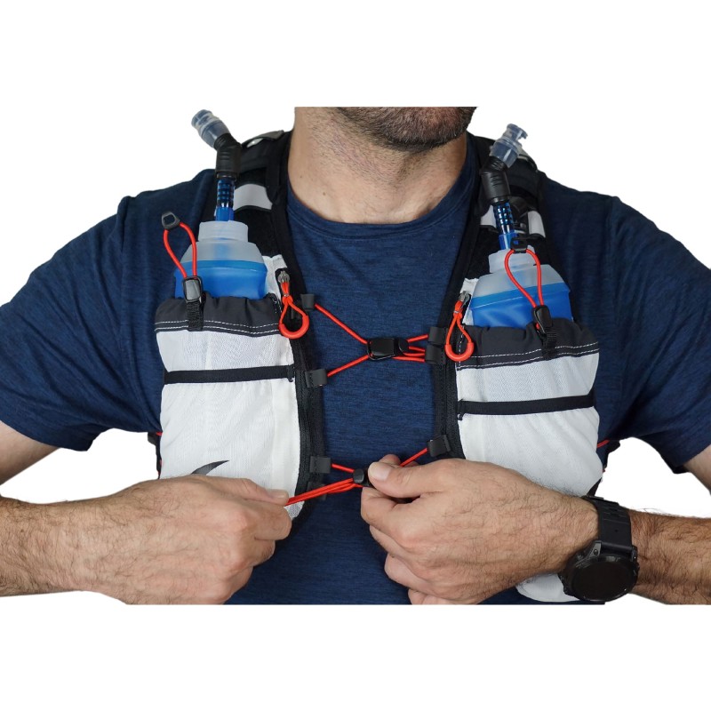 Sur le devant de la veste, on retrouve un mesh respirant de qualité (permettant de garder la fraîcheur du corps), des cordons élastiques avec système de Verrouillage automatique pour une stabilité parfaite, des poches avant à fermeture éclair (idéales pour sécuriser téléphone ou équipements), deux gourdes souples de 500mL incluses, deux poches à accès rapide et un sifflet de sécurité et des détails réfléchissants.