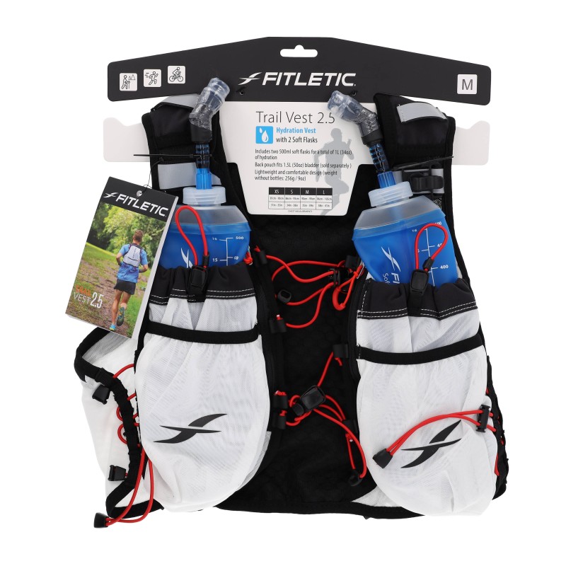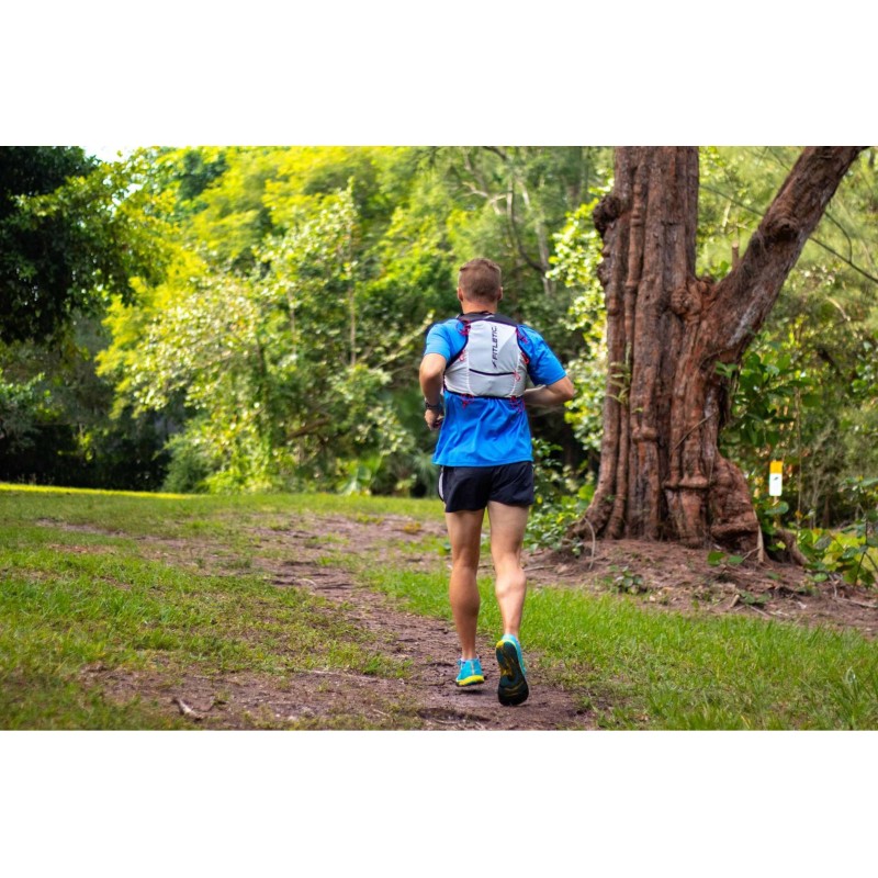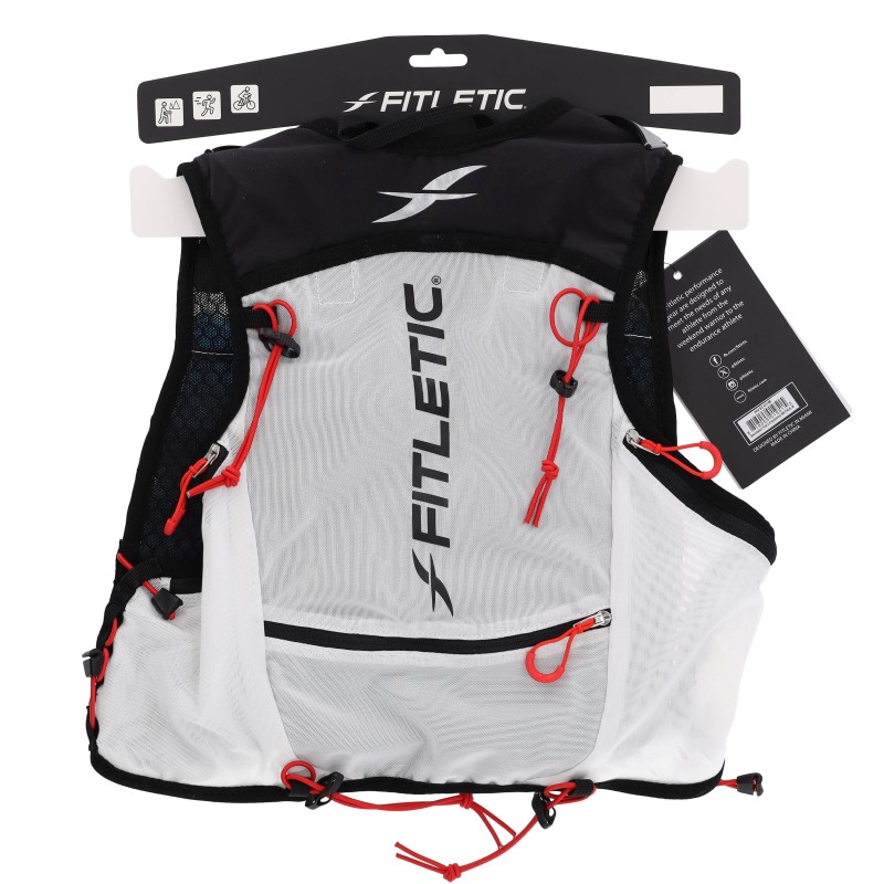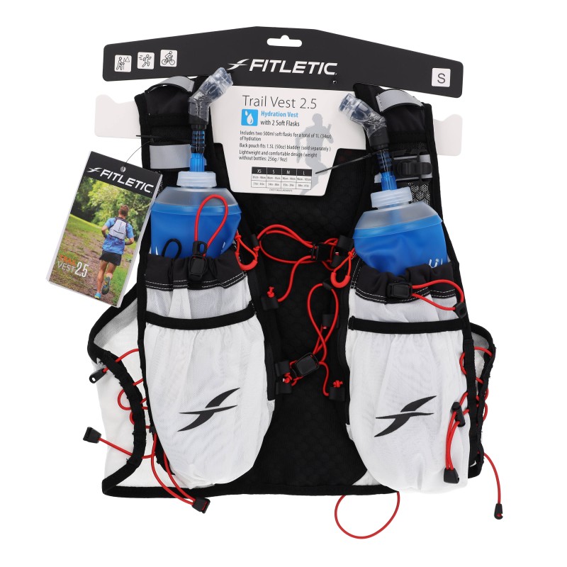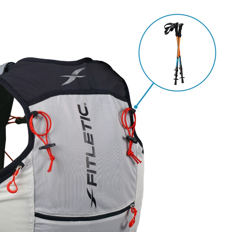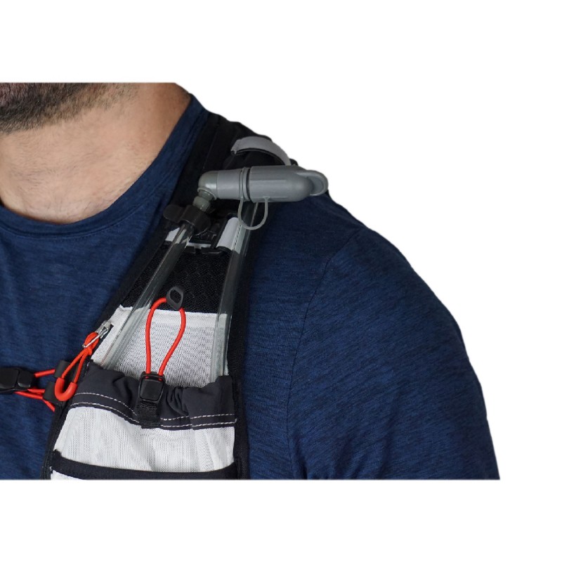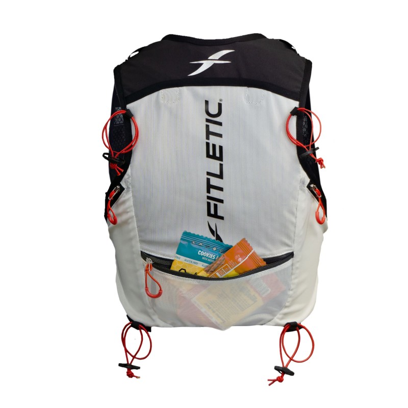 Sur le devant de la veste, on retrouve un mesh respirant de qualité (permettant de garder la fraîcheur du corps), des cordons élastiques avec système de Verrouillage automatique pour une stabilité parfaite, des poches avant à fermeture éclair (idéales pour sécuriser téléphone ou équipements), deux gourdes souples de 500mL incluses, deux poches à accès rapide et un sifflet de sécurité et des détails réfléchissants.