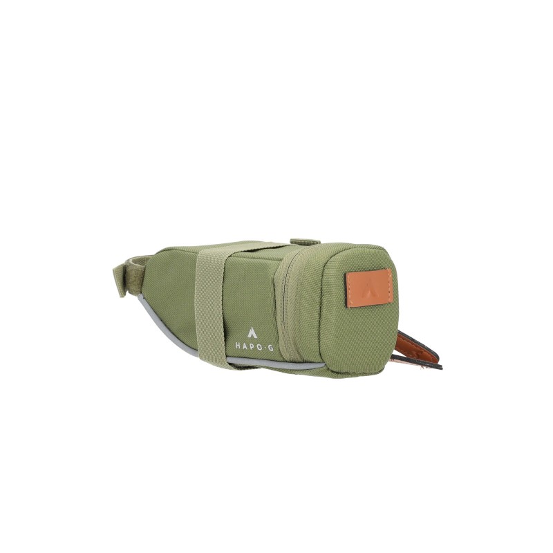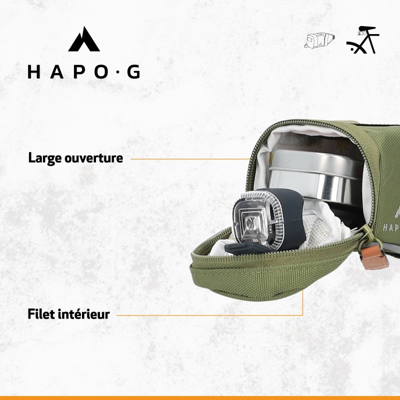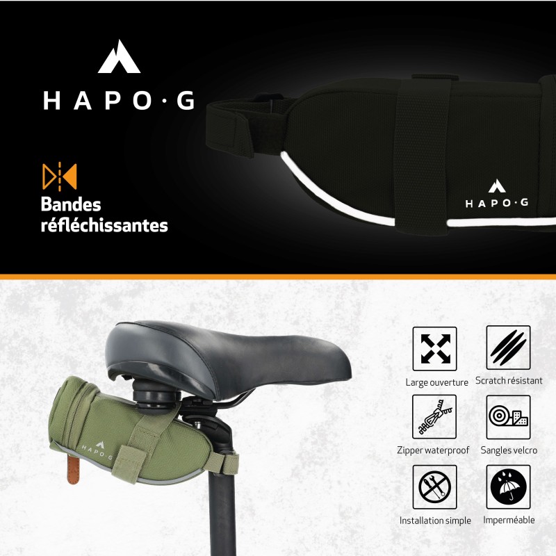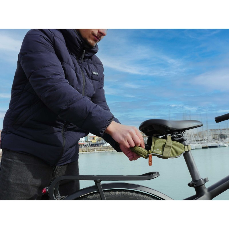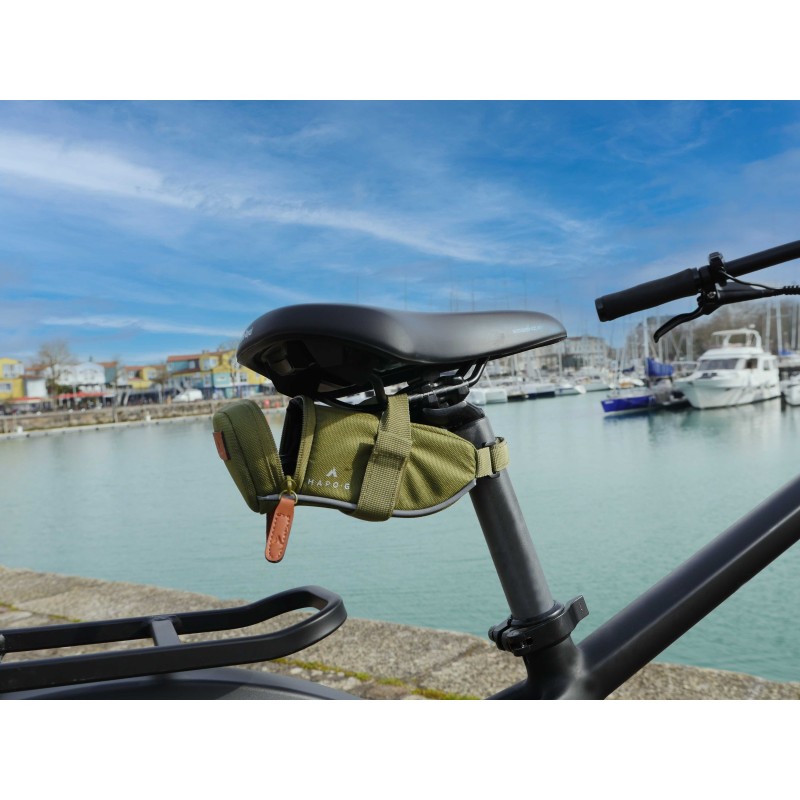 La sacoche de selle de la marque HAPO G s'installe grâce à deux sangles sous la selle et dispose d'une contenance de 0,7 litres.