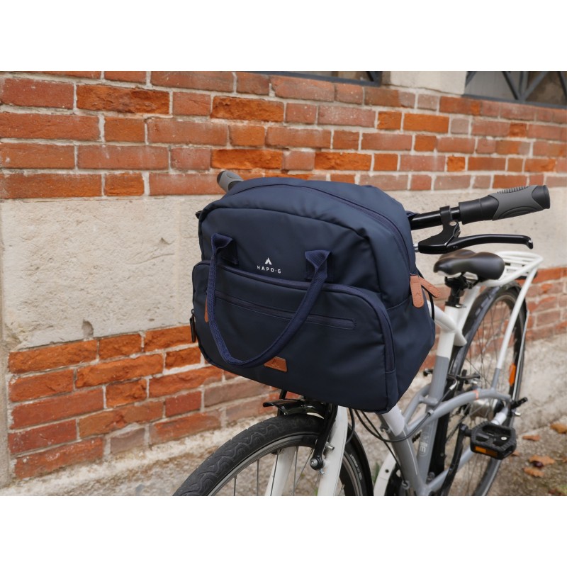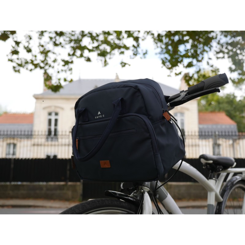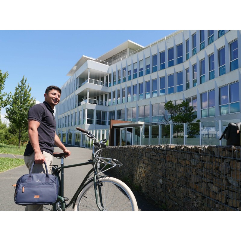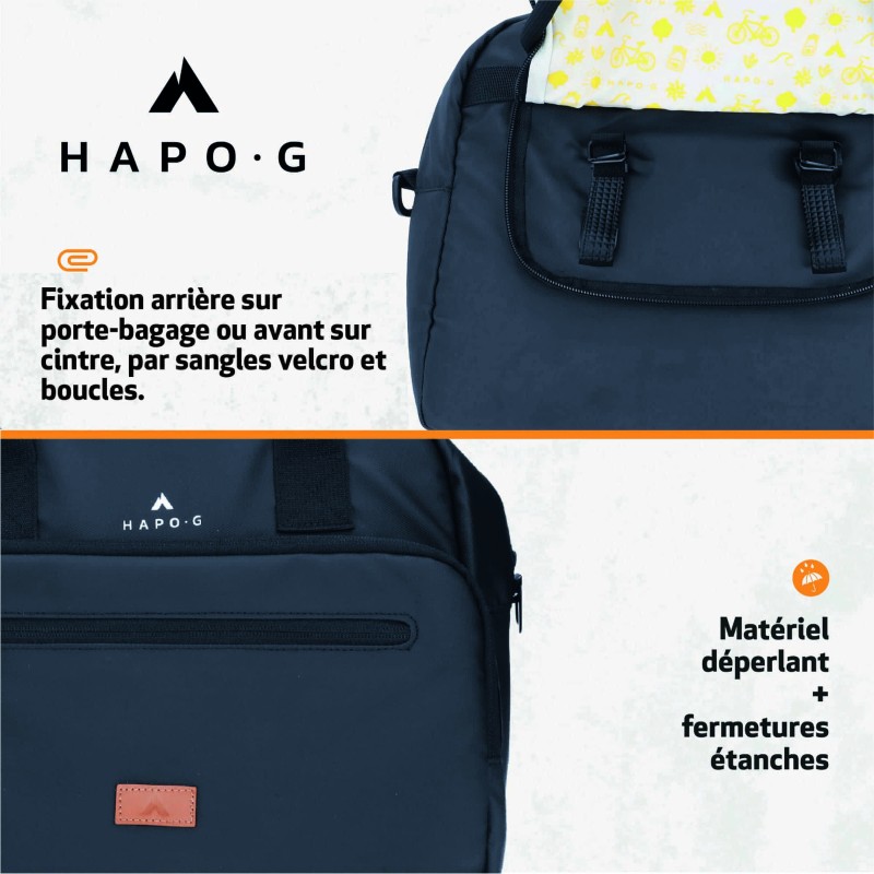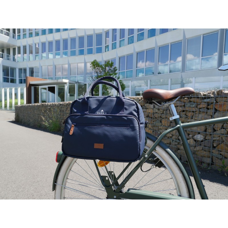 Cette sacoche vélotaf de la marque HAPO-G se fixe sur le porte-bagages du vélo et peut aussi se fixer sur le guidon.