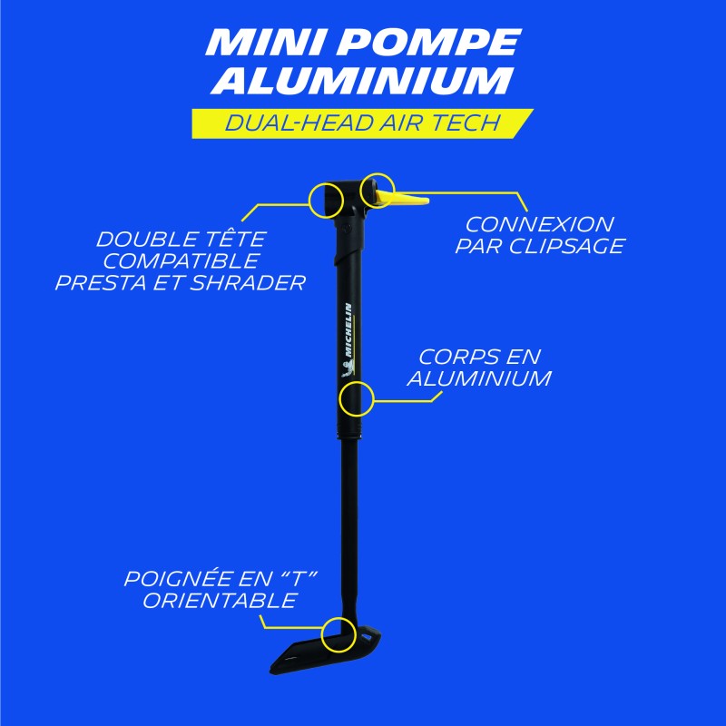 Caractéristiques de la mini-pompe aluminium Dual-Head MICHELIN AIR TECH :