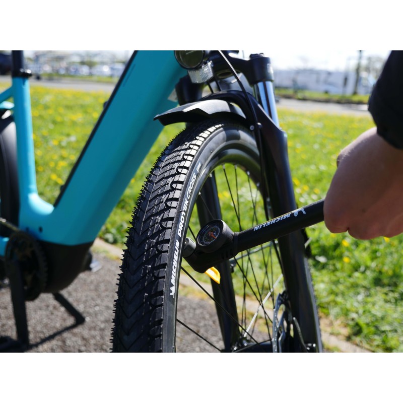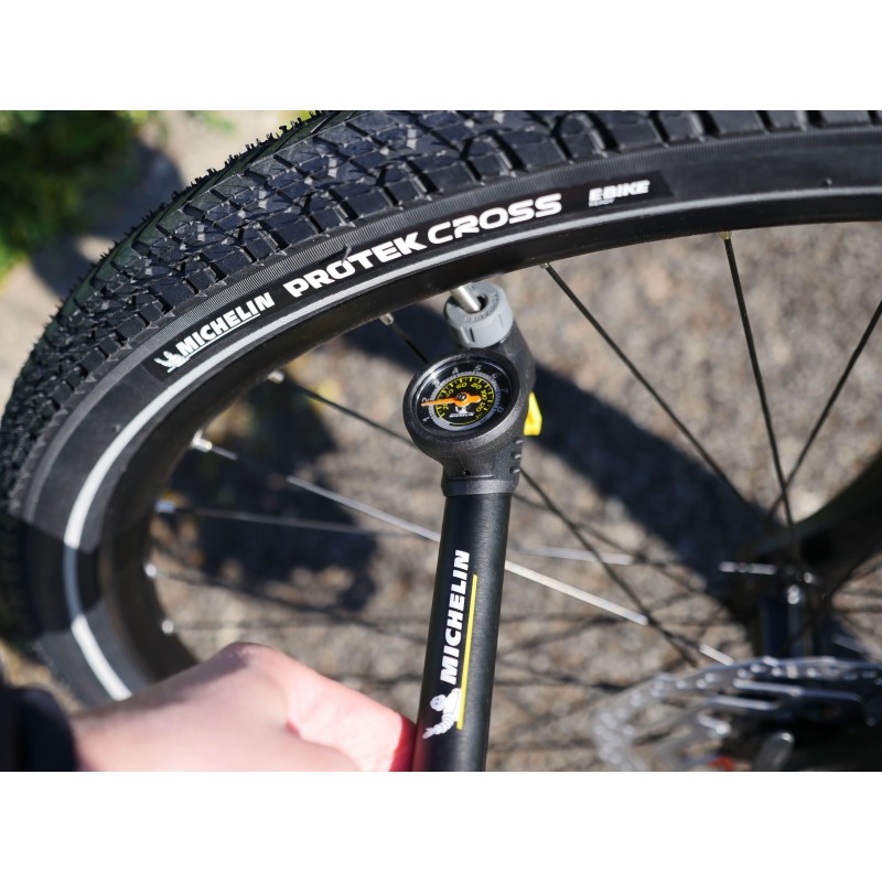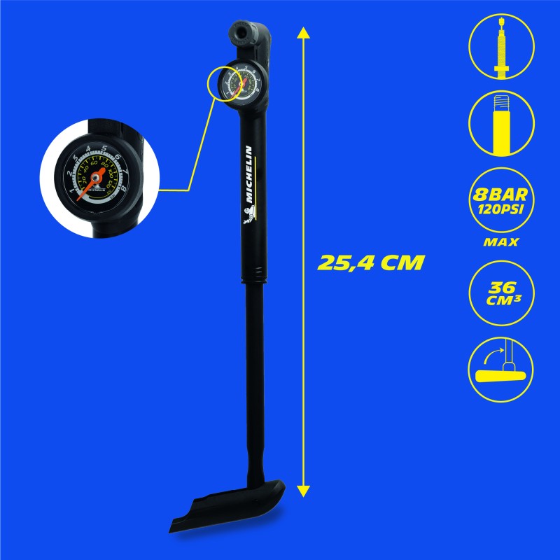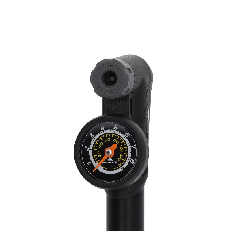 La mini-pompe à manomètre 'Clever valve' MICHELIN AIR TECH PRO permet de gonfler avec précision jusqu'à une pression maximale de 8 bars, soit 120 PSI.