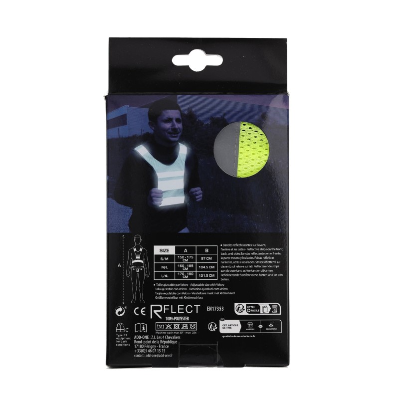Ses bandes réfléchissantes sur l'avant et au dos réagissent à la lumière des phares et permettent d'être parfaitement visible dans l'obscurité, dans les phares de véhicules ou sous des projecteurs.