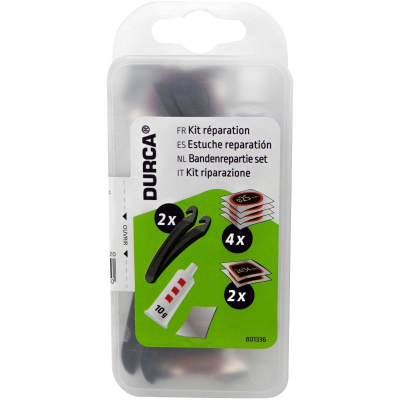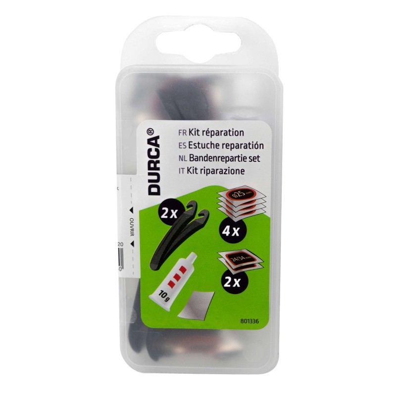 Kit de réparation de chambre à air2 démontes pneus4 patchs de 25 mm de diamètre.2 patchs de 24x34 mm.1 râpe1 tube de colle de dissolution de 10 g