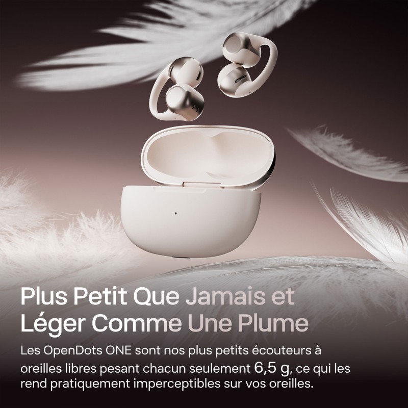 Interchangeables gauche/droite, les écouteurs OpenDots One permettent une charge rapide filaire et une charge sans fil ultra pratique, pour une autonomie combinée jusqu’à 40 heures.