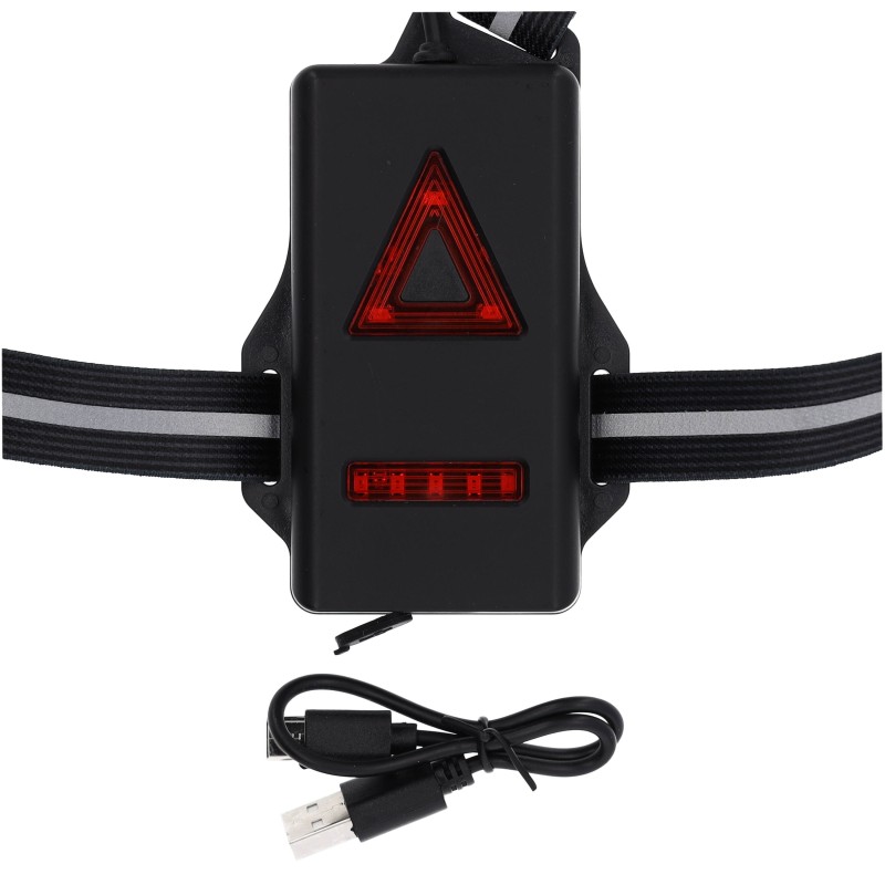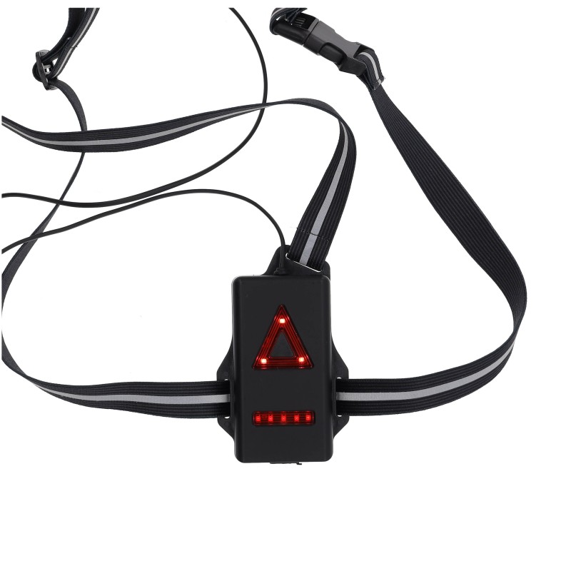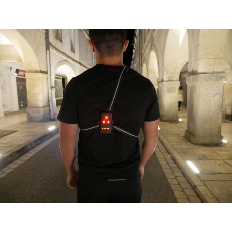 La Lampe Pectorale de Running NightViz comporte un indicateur de charge : 5 leds rouges situées sous le triangle. Lorsqu'une seule led s'éclaire, vous devez recharger votre lampe.