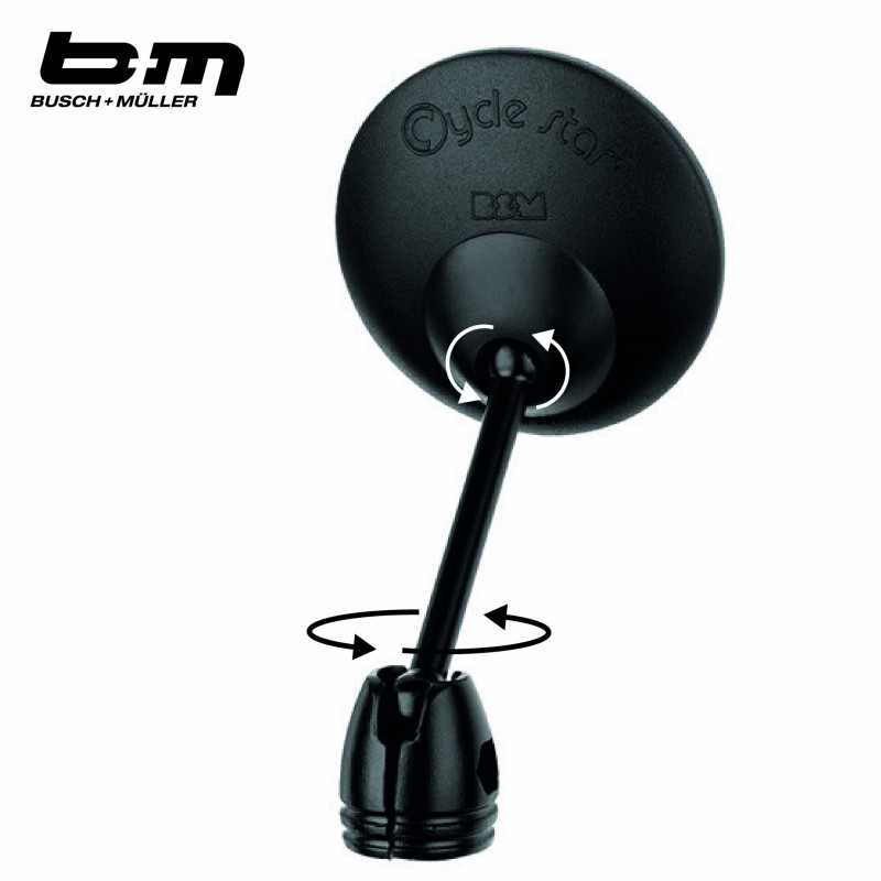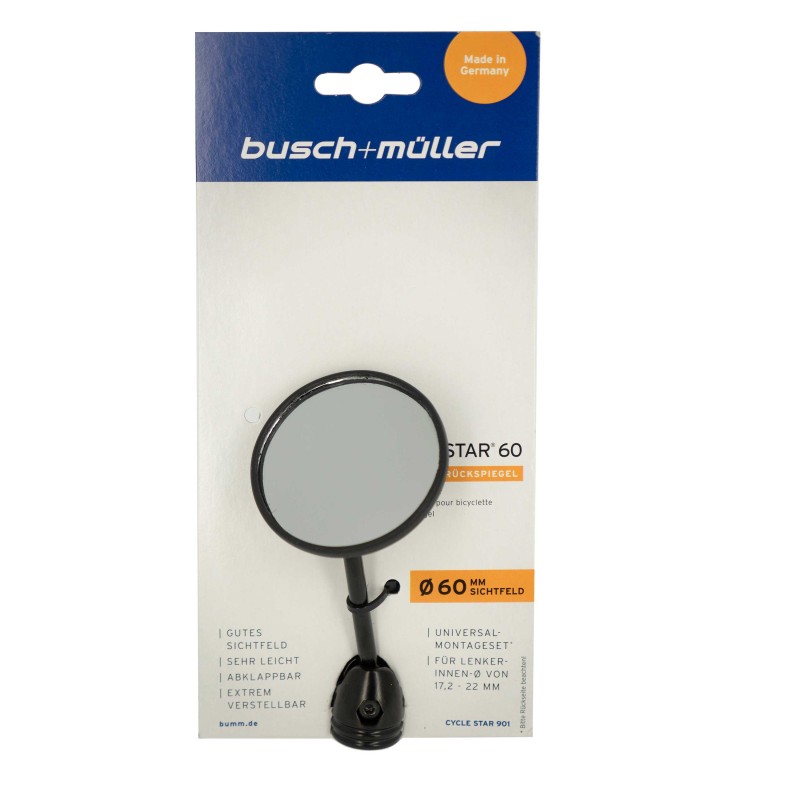 Le rétroviseur Cycle Star 60 mm de la marque BUSCH & MÜLLER offre un grand champ de vision. Il permet de se déplacer en toute sécurité en ayant une bonne visibilité sur l'arrière du vélo. Le produit est équipé d'une petite tige métallique. Le verre à un diamètre de 60 mm et est protégé contre les éclats de verre.
