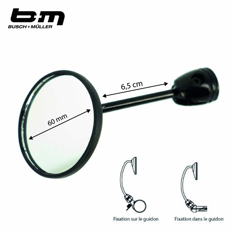 Le rétroviseur Cycle Star 60 mm de la marque BUSCH & MÜLLER offre un grand champ de vision. Il permet de se déplacer en toute sécurité en ayant une bonne visibilité sur l'arrière du vélo. Il est équipé d'une petite tige métallique courbée. Le verre à un diamètre de 60 mm et est protégé contre les éclats de verre.Le boîtier en plastique noir...