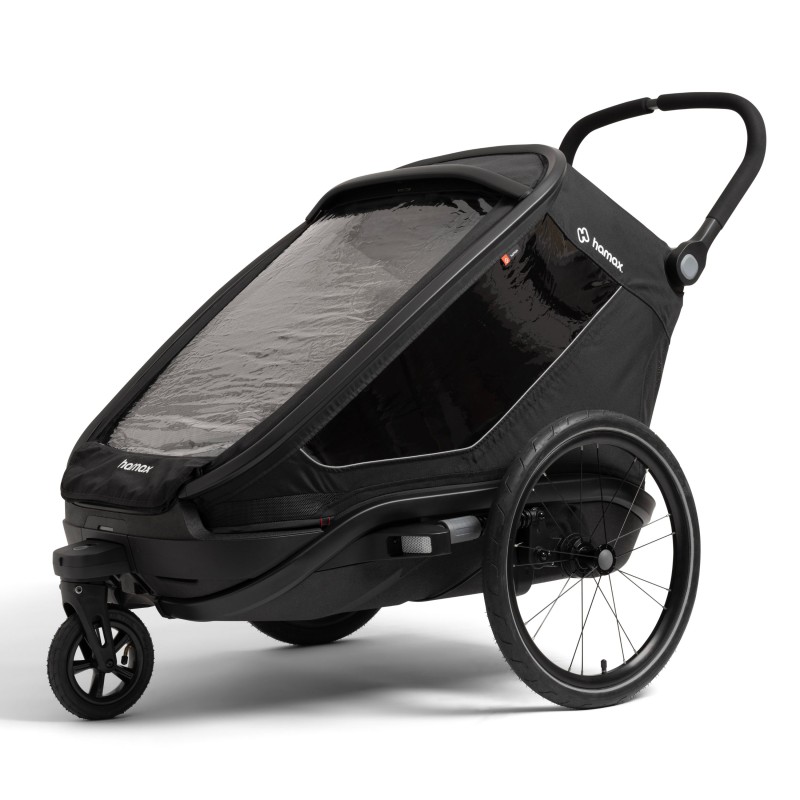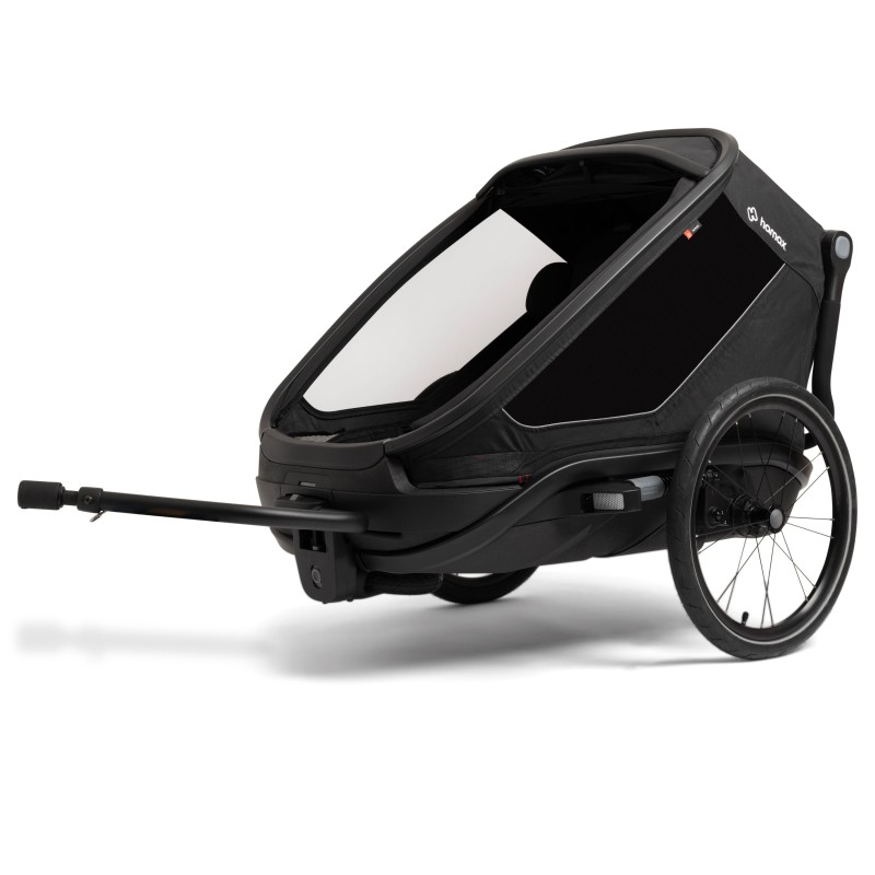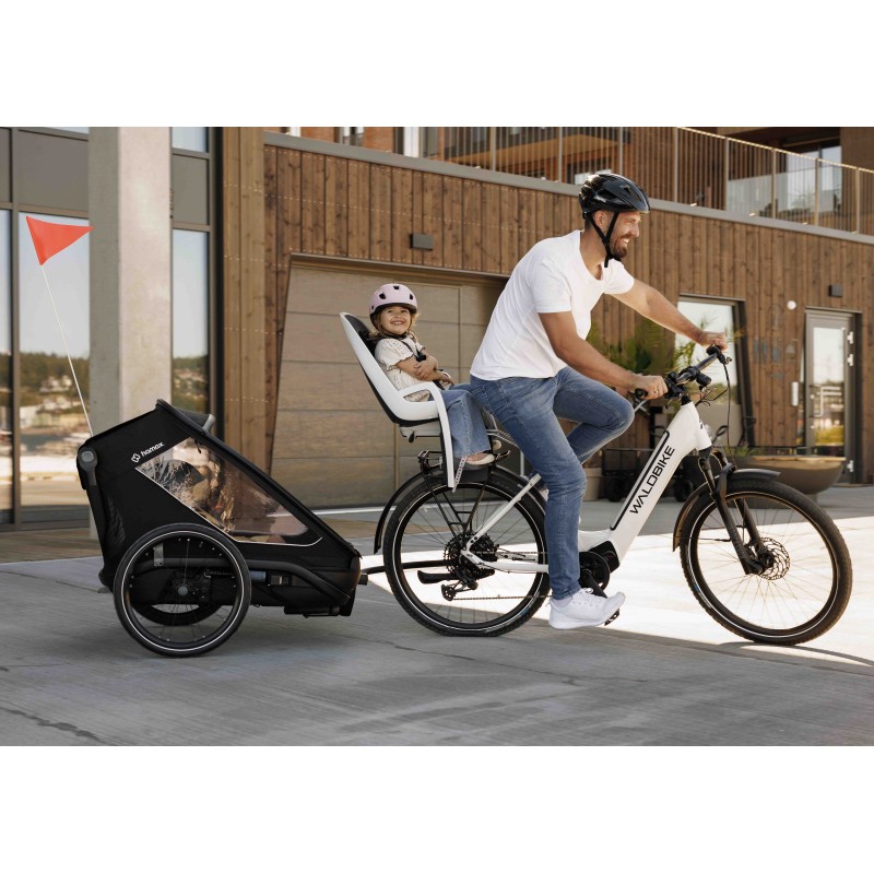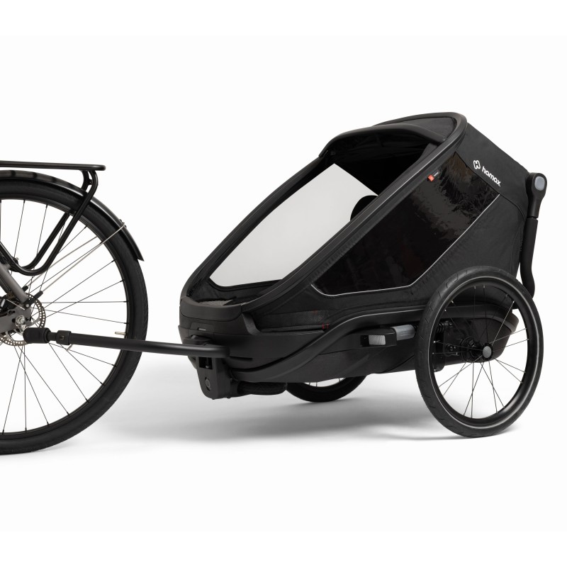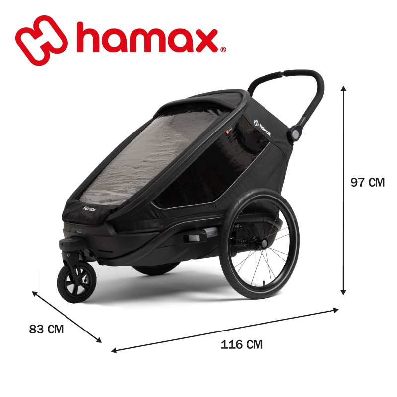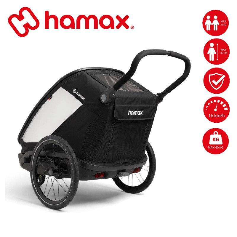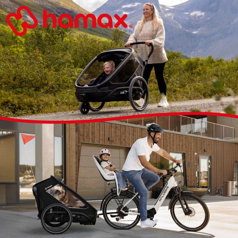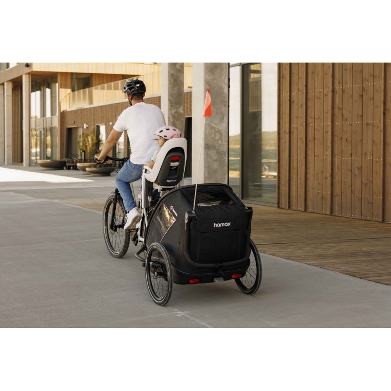 Légère et polyvalente, la remorque OUTBACK NEXT de la marque HAMAX permet aux enfants d'être protégés lors de balades à vélo, vélo électrique ou de randonnées.