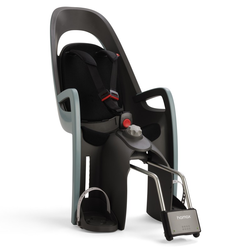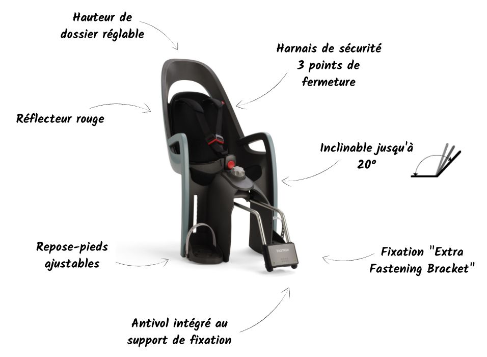 Le porte-bébé haut de gamme Caress de la marque HAMAX est destiné à être fixé au cadre du vélo, sur le tube de selle, grâce à un support de fixation « Extra Fastening Bracket » à dégagement rapide.