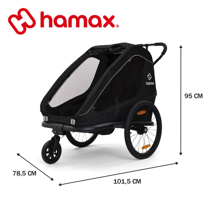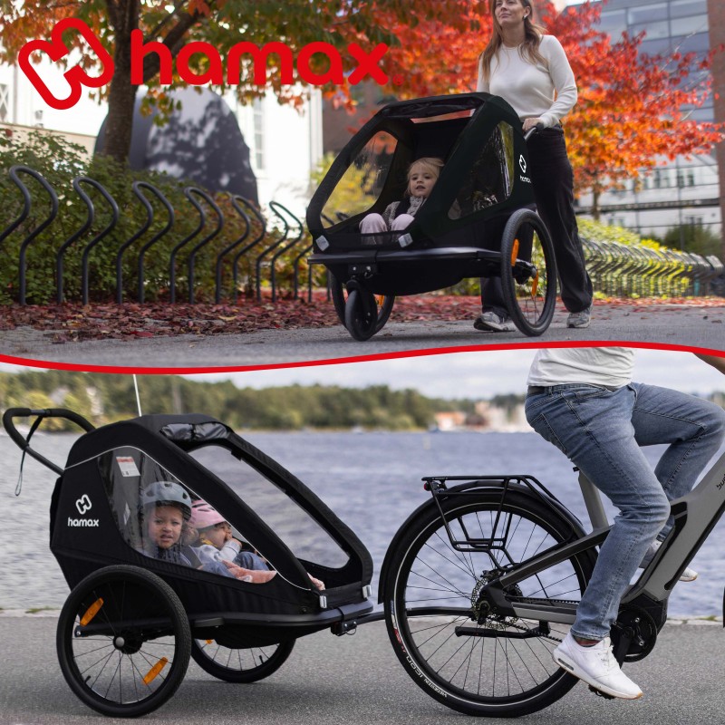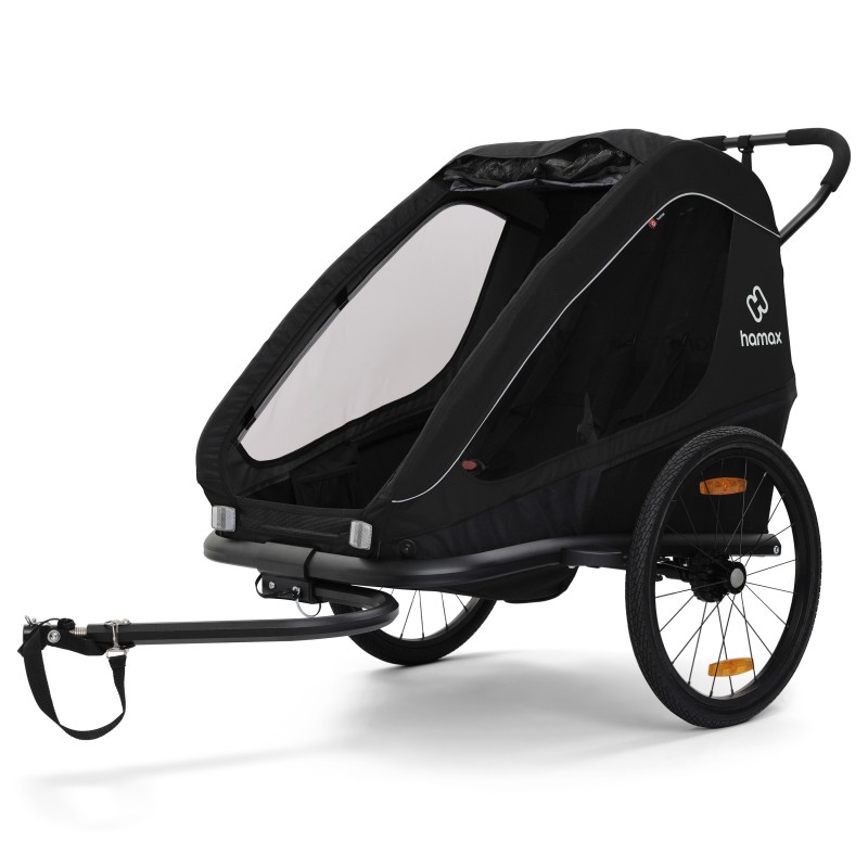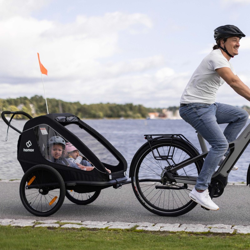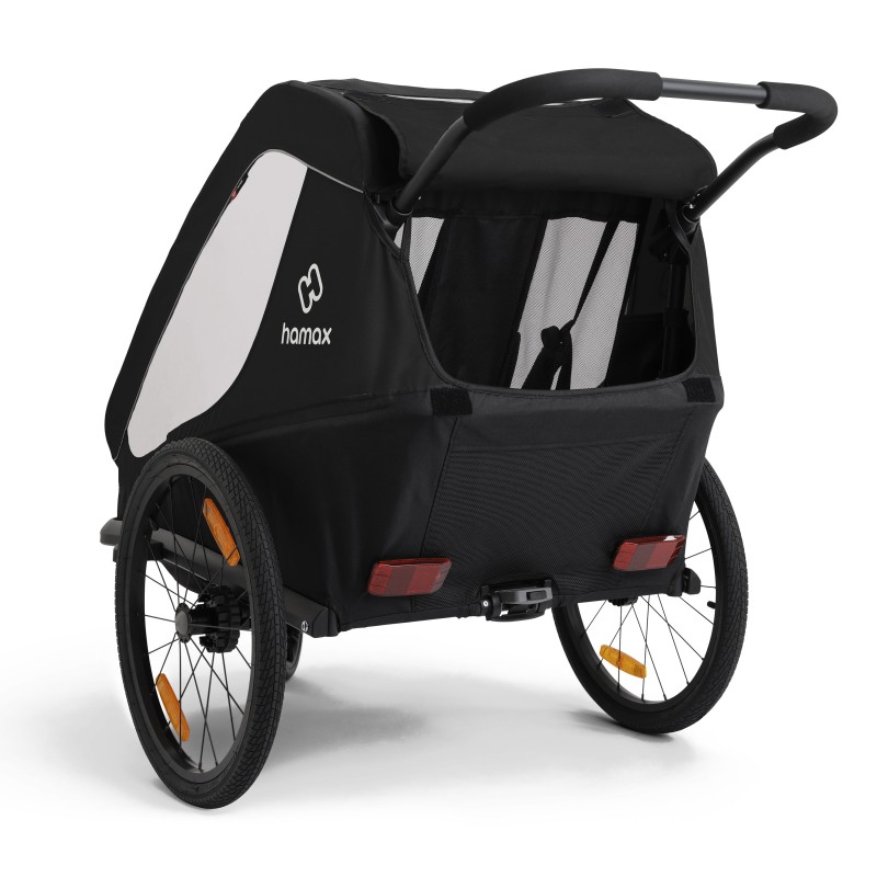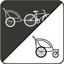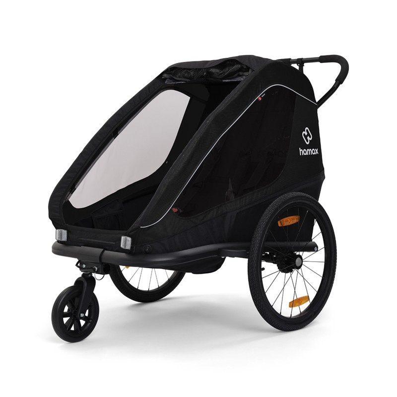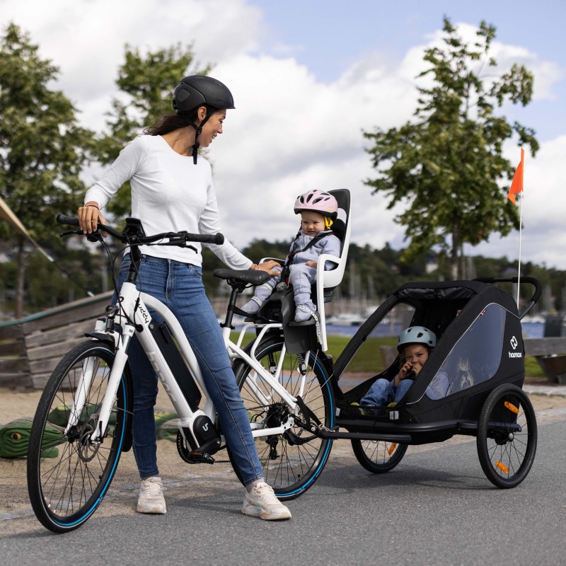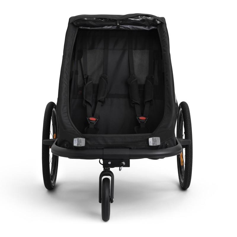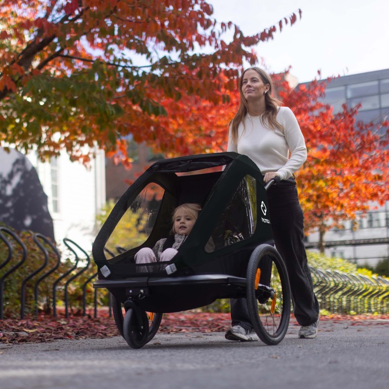 Traveller est une remorque pour vélo légère et pratique qui peut être facilement transformée en poussette en remplaçant le bras d’attelage par une roue de poussette.