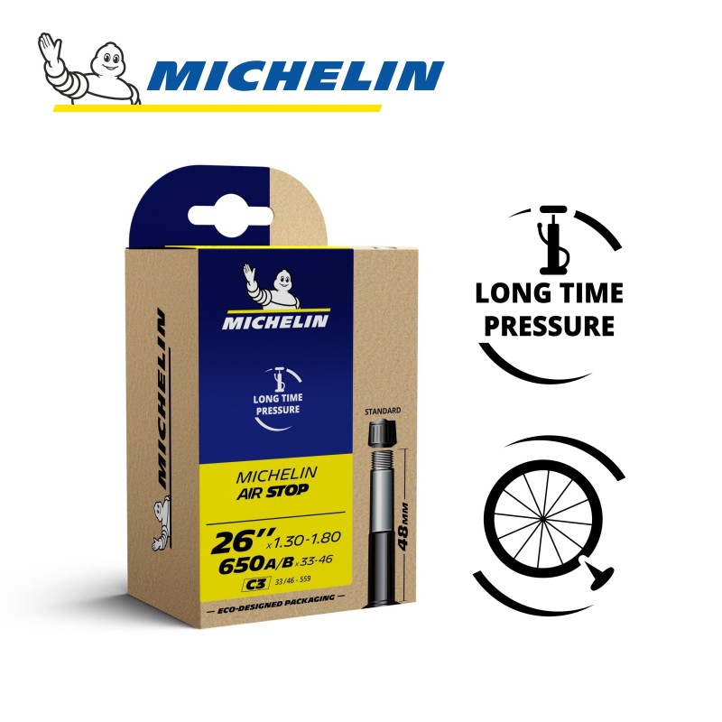 La chambre à air MICHELIN C3 AIRSTOP 650A/B x 33-46 ou 26"x 1.30-1.80 33/46x559 ST 48mm, référence CAI 037829 de la marque, gamme Access Line, offre un bon maintien de la pression grâce au butyl et une bonne résistance aux crevaisons. C'est un standard du marché avec un excellent rapport Qualité/Prix.