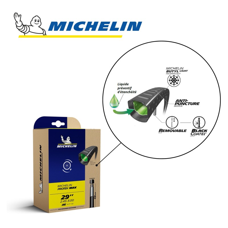La chambre à air MICHELIN A6 PROTEK MAX 29" x 2,45-3,00 62/77x622 ST 48mm référence CAI 593675 de la marque, gamme Competition Line, offre un design spécifique associé à un liquide intérieur qui offre une garantie de pression optimale et une excellente résistance à la crevaison. Ainsi en compression, un trou se bouche naturellement.
