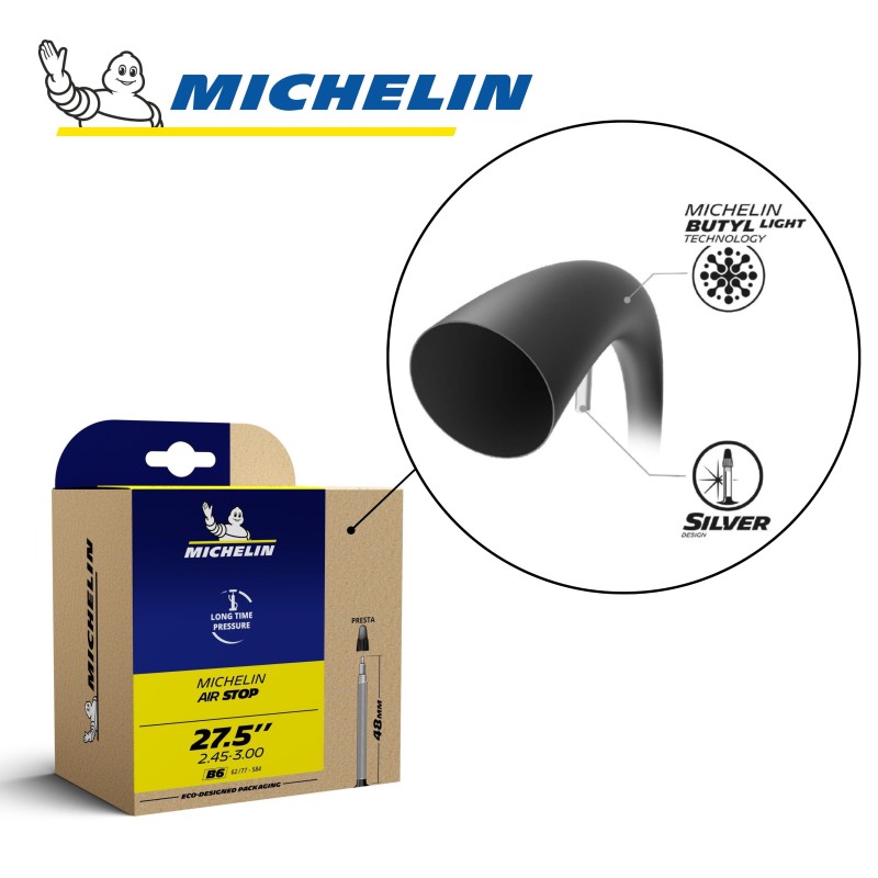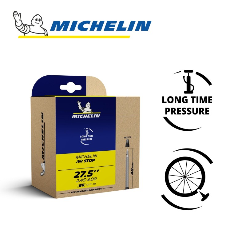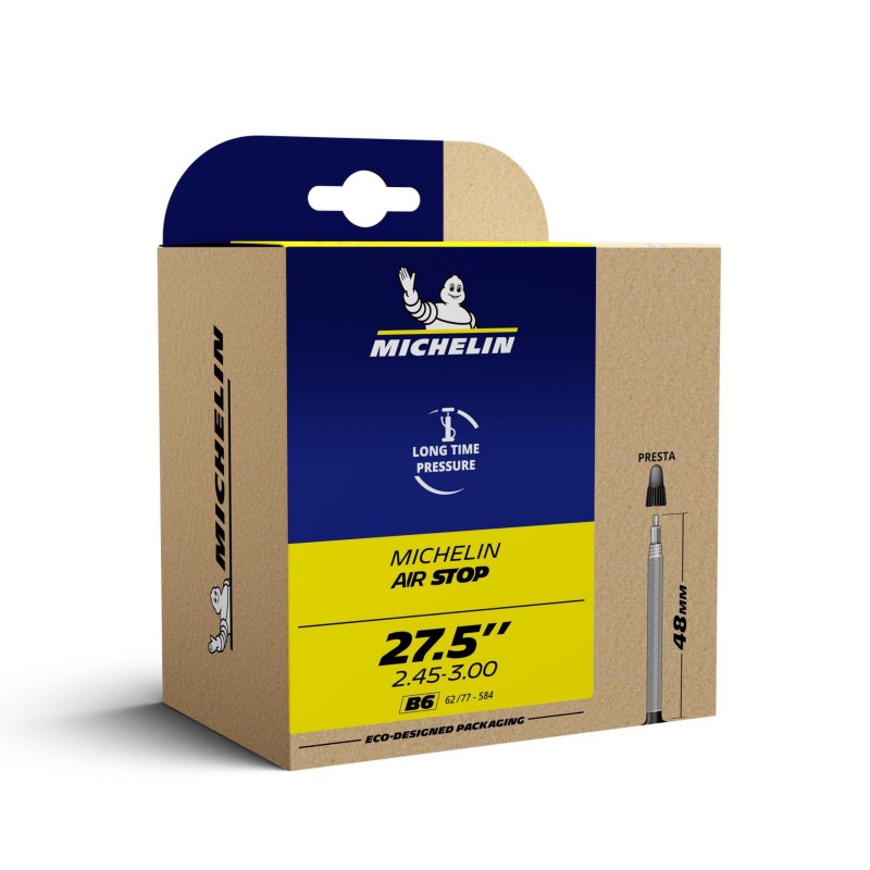 La chambre à air MICHELIN B6 AIRSTOP 27.5" x 2.45-3.00 62/77x584 PR 48mm, référence CAI 716374 de la marque, gamme Access Line, offre un bon maintien de la pression grâce au butyl et une bonne résistance aux crevaisons. C'est un standard du marché avec un excellent rapport Qualité/Prix.