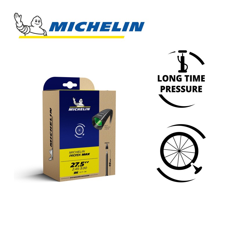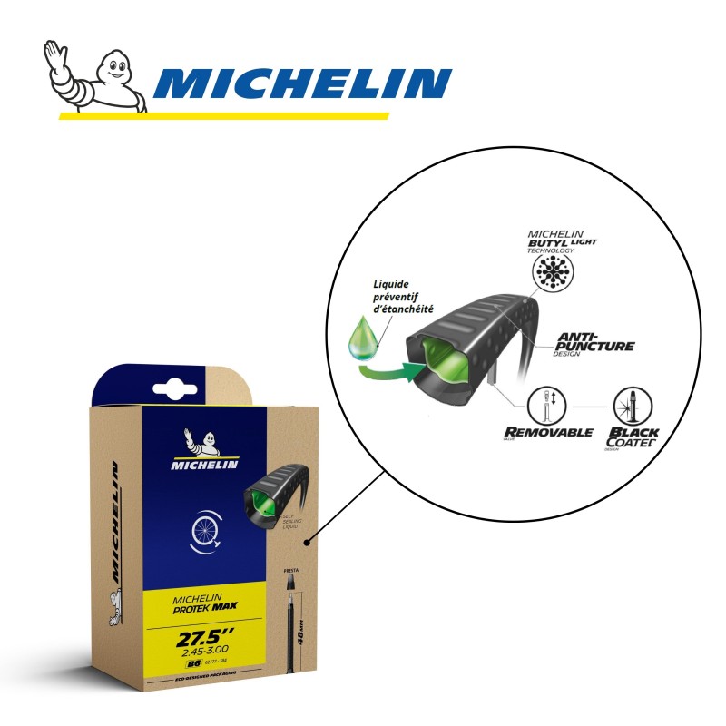 La chambre à air MICHELIN B6 PROTEK MAX 27,5" x 2,45-3,00 62/77x584 PR 48 référence CAI 817860 de la marque, gamme Compétition Line, offre un design spécifique associé à un liquide intérieur qui offre une garantie de pression optimale et une excellente résistance à la crevaison. Ainsi en compression, un trou se bouche naturellement.