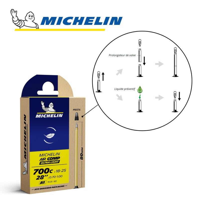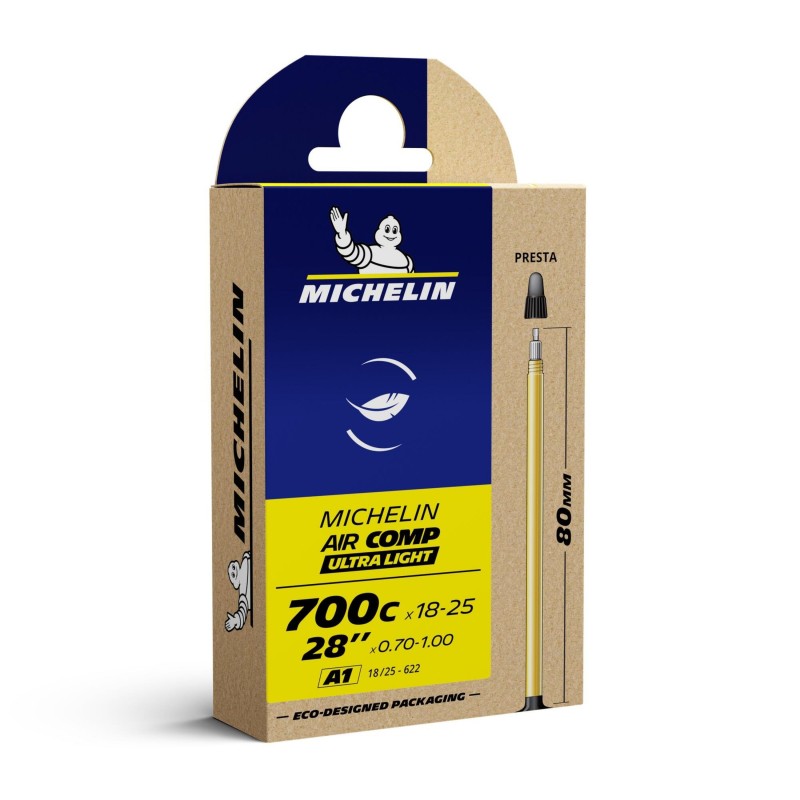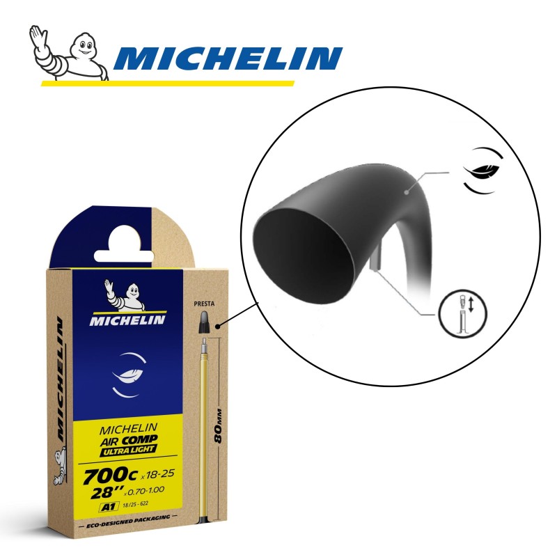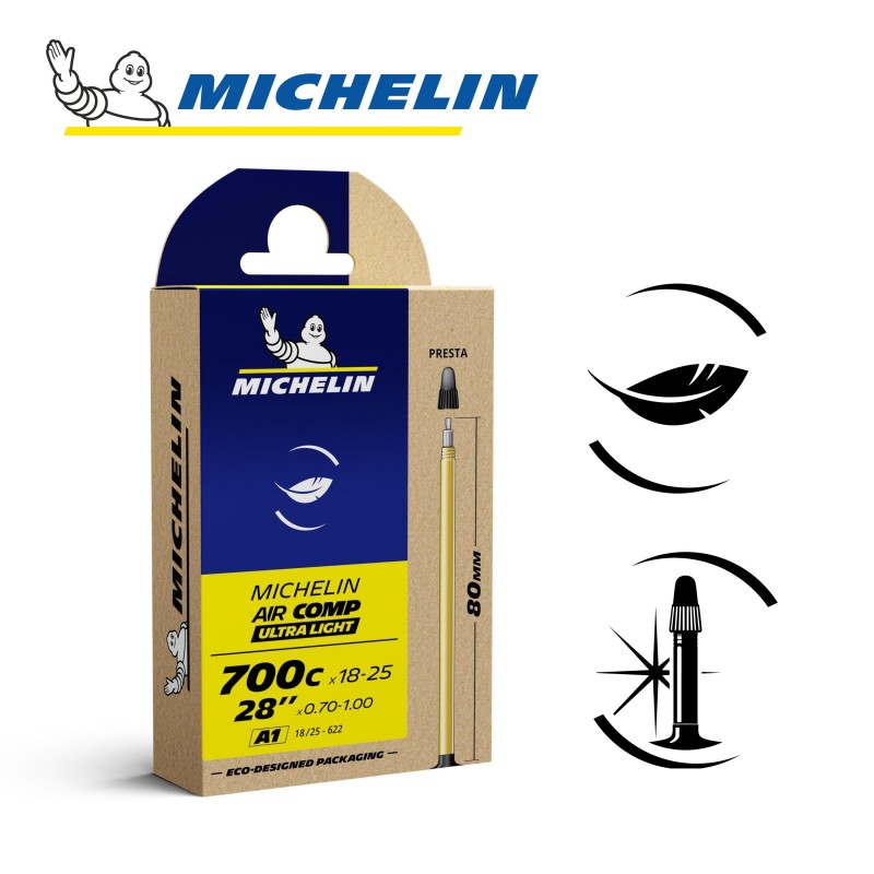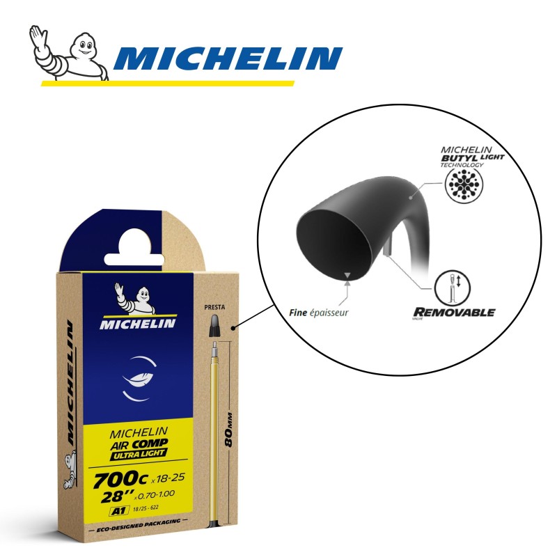 La chambre à air MICHELIN A1 AIRCOMP ULTRALIGHT 700Cx18-25 ou 28" x 0,70-1,00 18/25x622 PR 80mm, référence CAI 837288 de la marque, gamme Compétition Line, est la plus légère (25% plus légère qu'une chambre à air AIRSTOP). Elle donne des ailes pour la compétition!