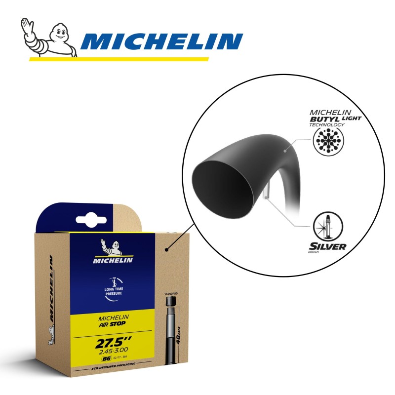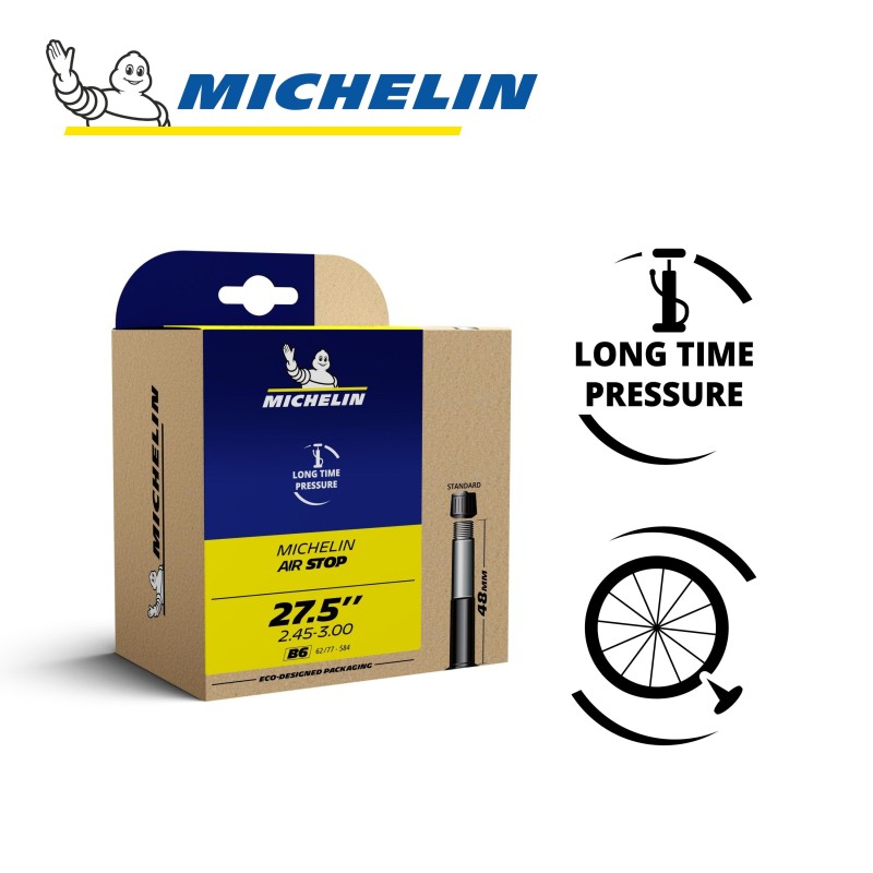 La chambre à air MICHELIN B6 AIRSTOP 27.5"X2.45-3.00 62/77x584 ST 48mm, référence CAI 935585 de la marque, gamme Access Line, offre un bon maintien de la pression grâce au butyl et une bonne résistance aux crevaisons. C'est un standard du marché avec un excellent rapport Qualité/Prix.
