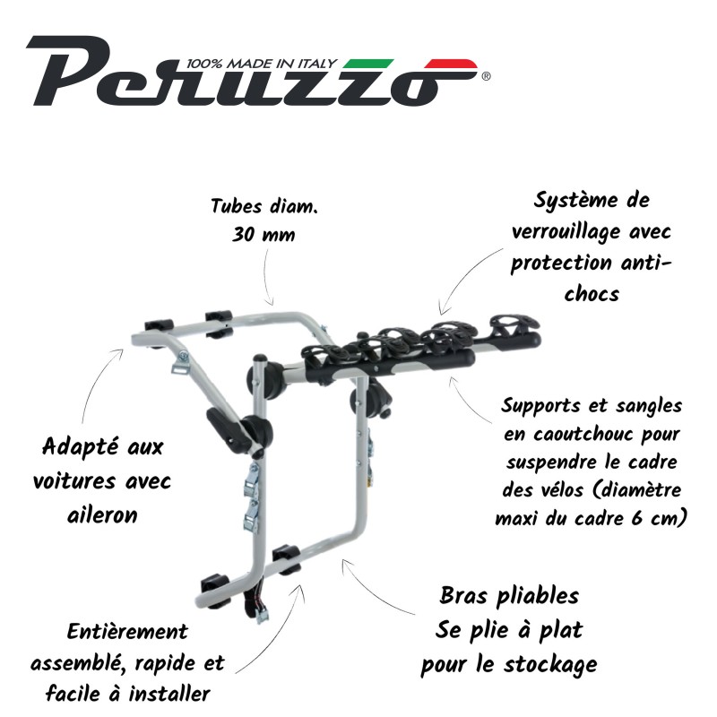 Le porte-vélo de coffre VENEZIA de la marque PERUZZO vous permettra de transporter jusqu’à 3 vélos (45kg maximum). Le porte-vélo VENEZIA est doté d’un système de verrouillage des vélos avec une protection anti-chocs. Livré entièrement assemblé, il est rapide et facile à installer. Il se plie à plat ce qui permet un rangement simple et rapide.